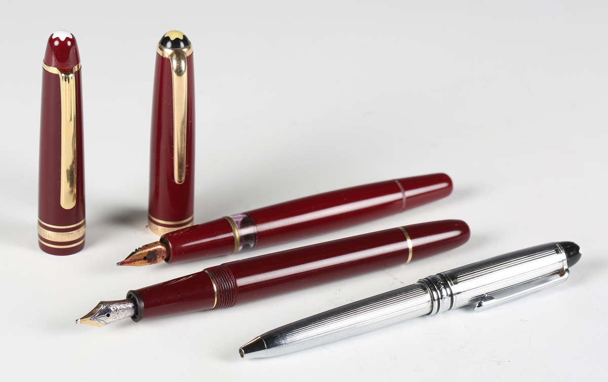 A Montblanc Meisterstück claret and gilt metal cased fountain pen, length 14cm, another similar fountain pen and a ballpoint pen.