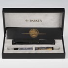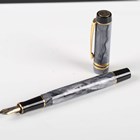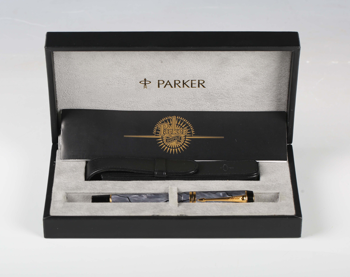 A Parker Duofold fountain pen with marbled grey casing, boxed with leather case.