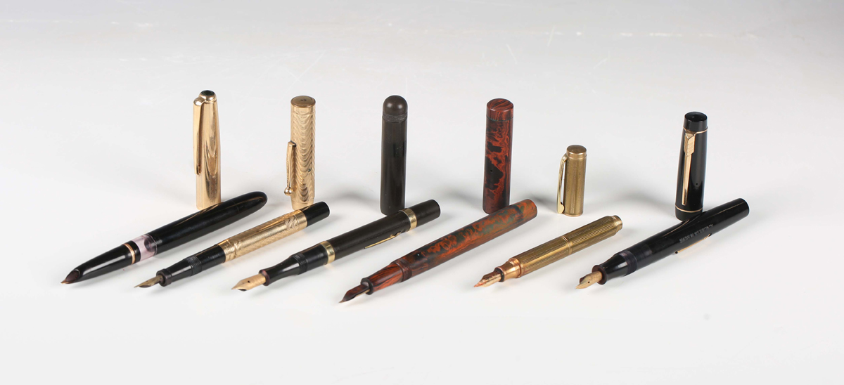 A group of six fountain pens, including an Onoto with gilt metal cap, a Morrison gilt metal cased pen and 'The Croxley Pen'.