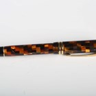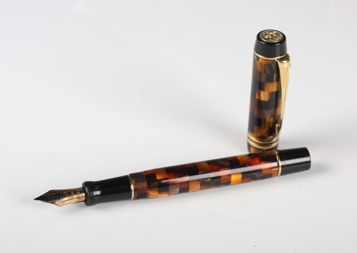 A modern Parker Duofold fountain pen with black and honey chequered casing, length 13.7cm.