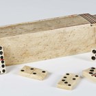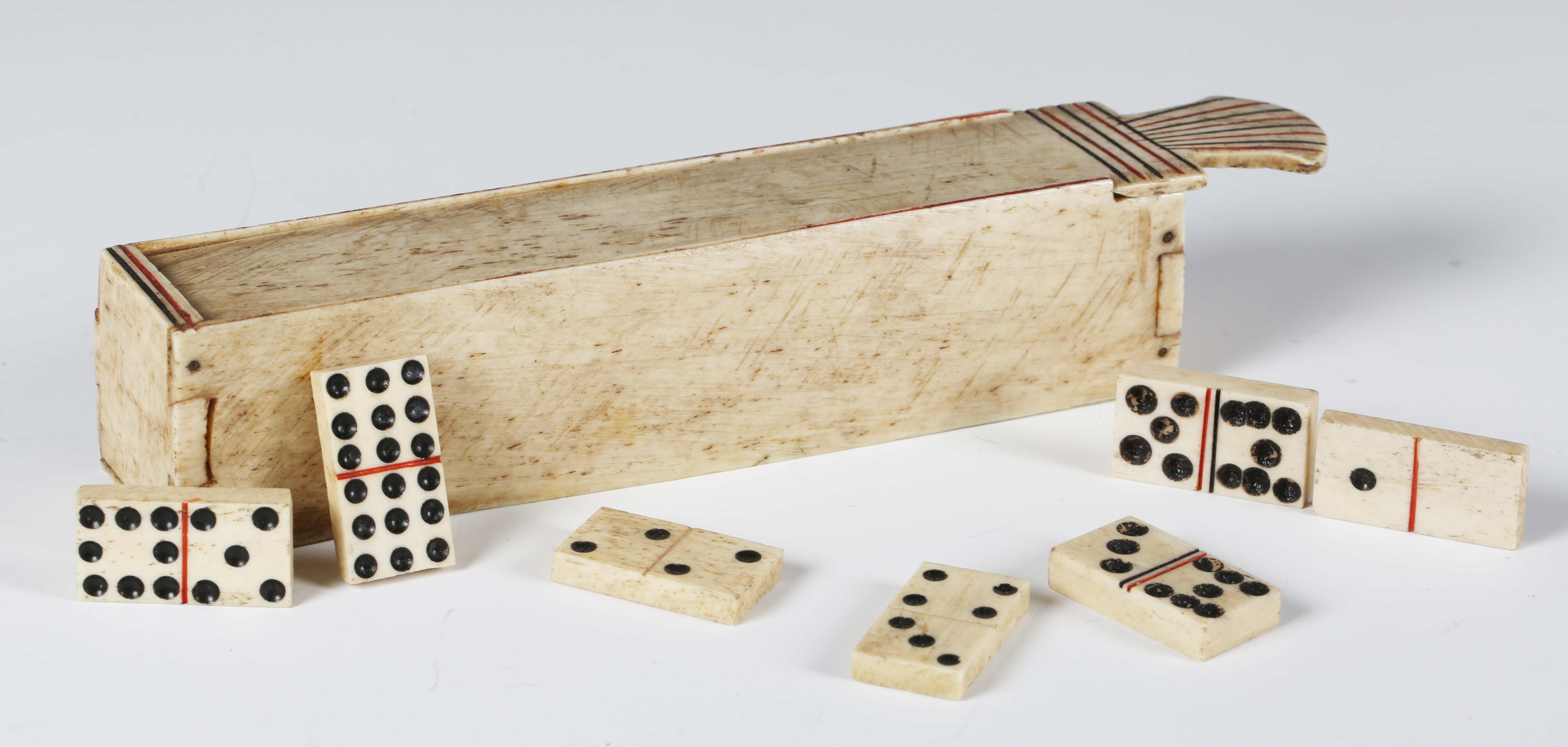 A late 18th/early 19th century bone prisoner-of-war dominoes set, with their original box with sliding lid, length 17.5cm.