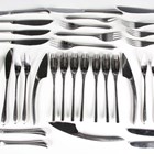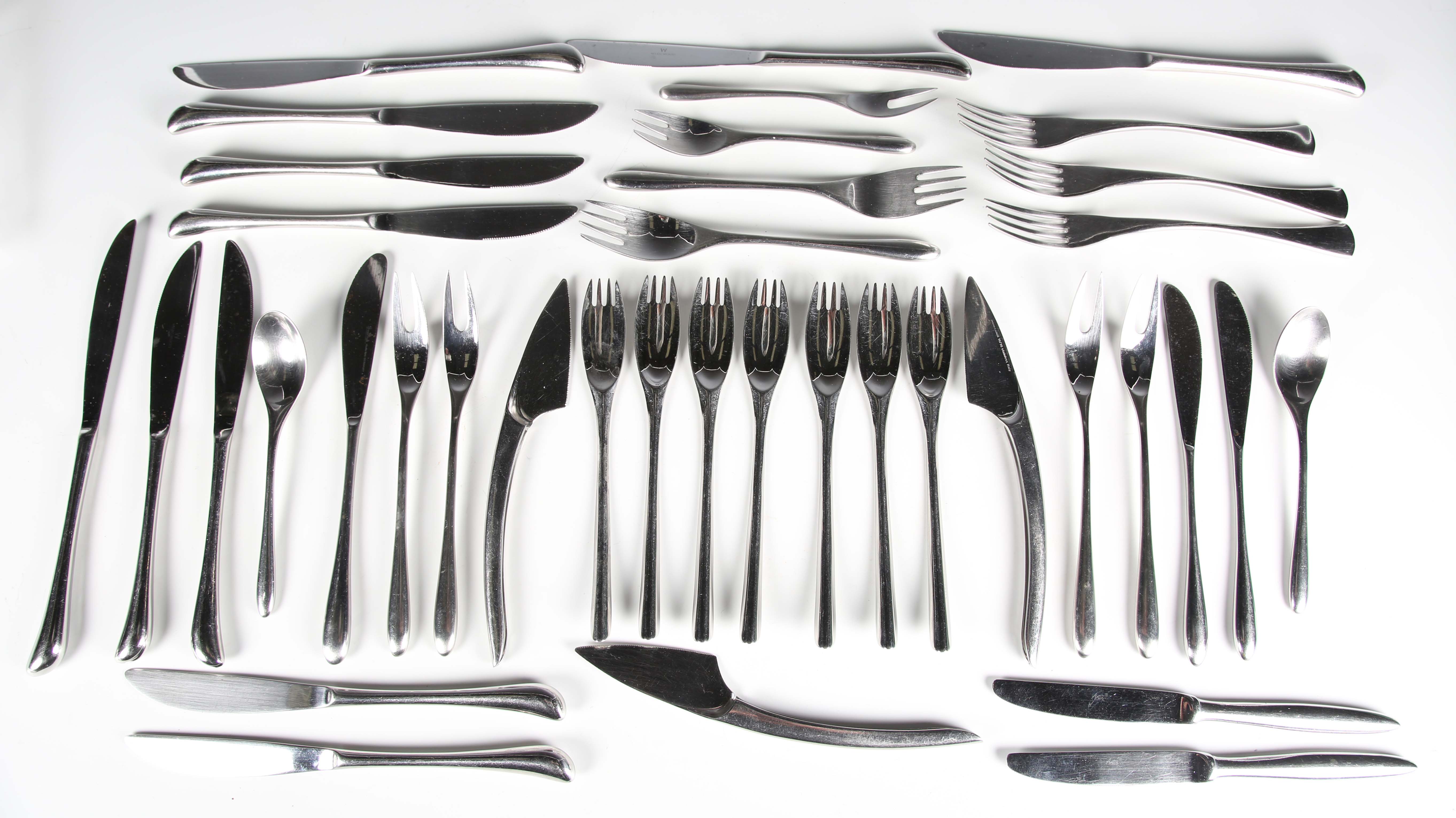 An Italian Zani & Zani part canteen of stainless steel Instrumenta pattern cutlery, designed by Lino Sabattini, circa 1978, comprising three table knives and seven table forks, a Rosenthal Studio-line part canteen of stainless steel Taille pattern cutlery, designed by Tapio Wirkkala, comprising a table knife, two table forks, two dessert knives, dessert fork, two dessert spoons, four two pronged forks and a matching smaller fork, and a Wedgwood part canteen of stainless steel Elipse pattern cutlery, comprising four table knives, three table forks, and seven dessert knives, together with two Artis stainless steel dessert knives.