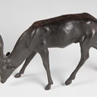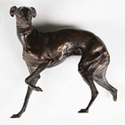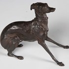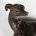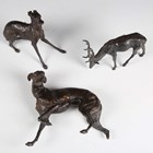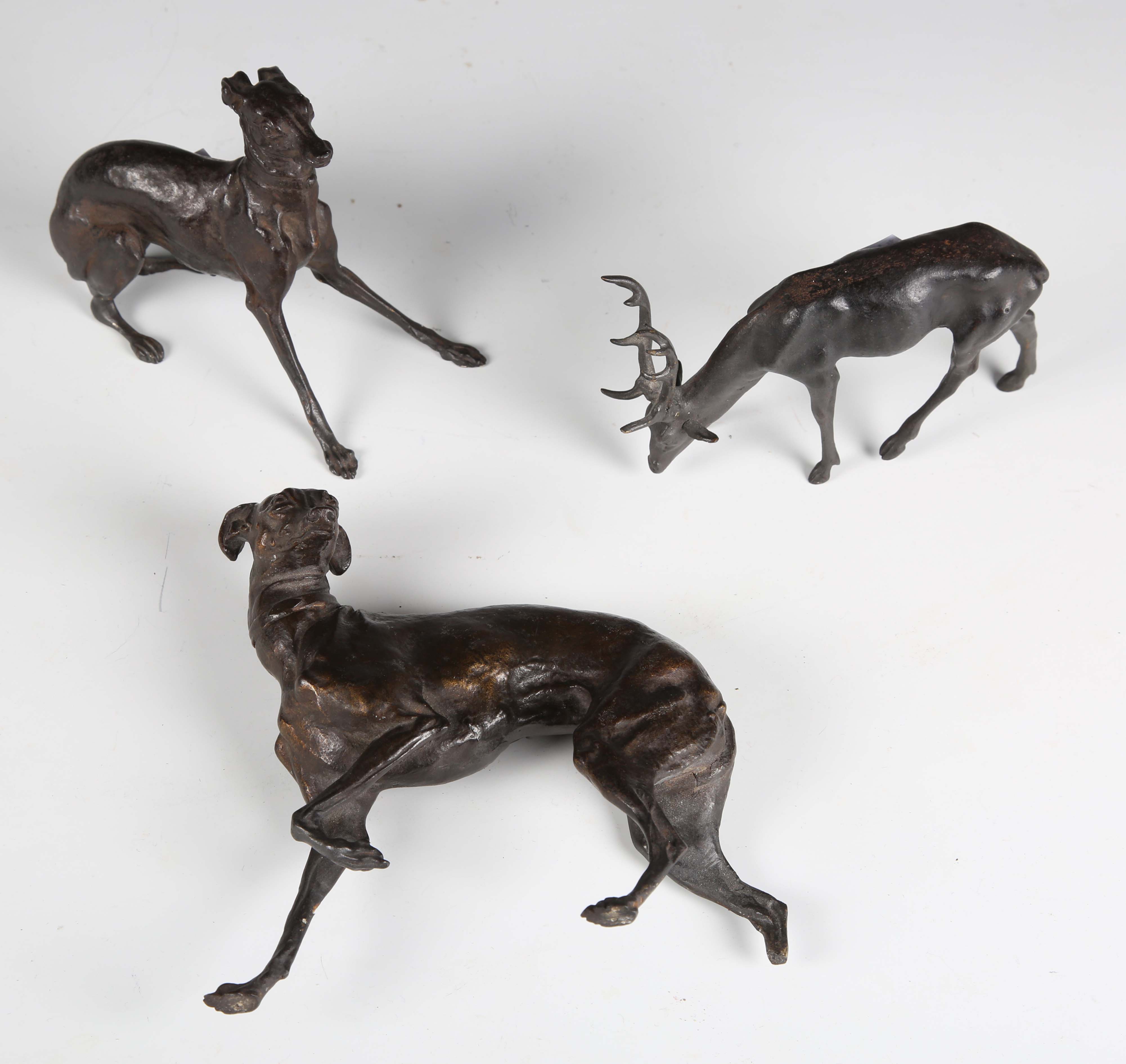 After Pierre-Jules Mêne - an early 20th century brown patinated cast bronze model of a whippet, height 14.5cm (lacking foot), together with another similar model of a whippet and a cast bronze model of a stag, length 13cm.
