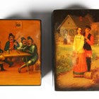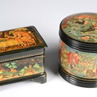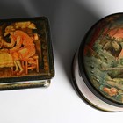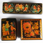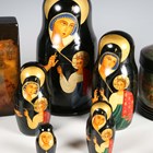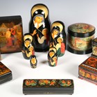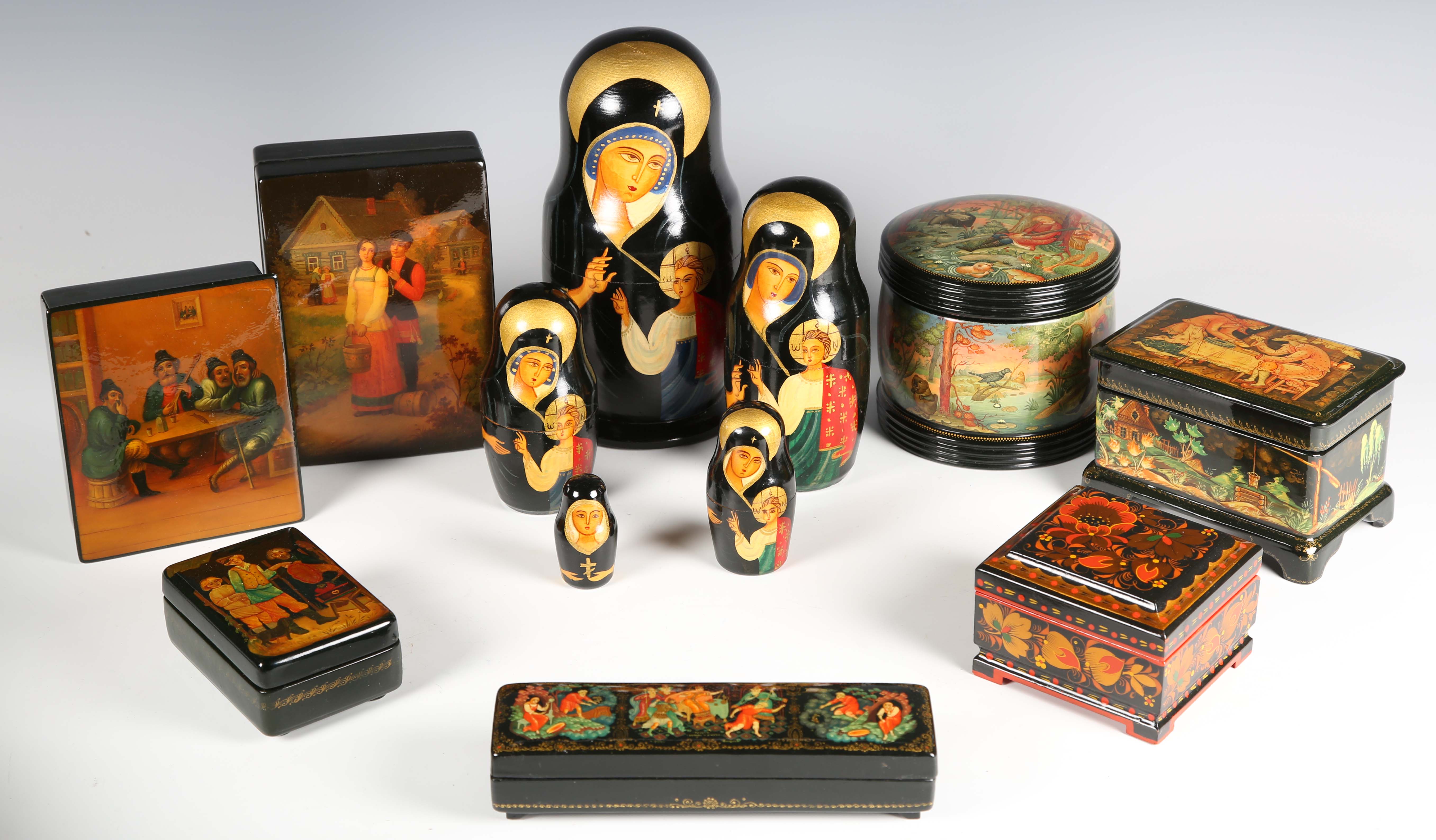 A collection of seven late 20th century Russian lacquer boxes and a Russian matryoshka doll.