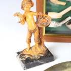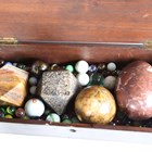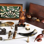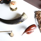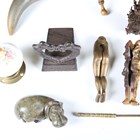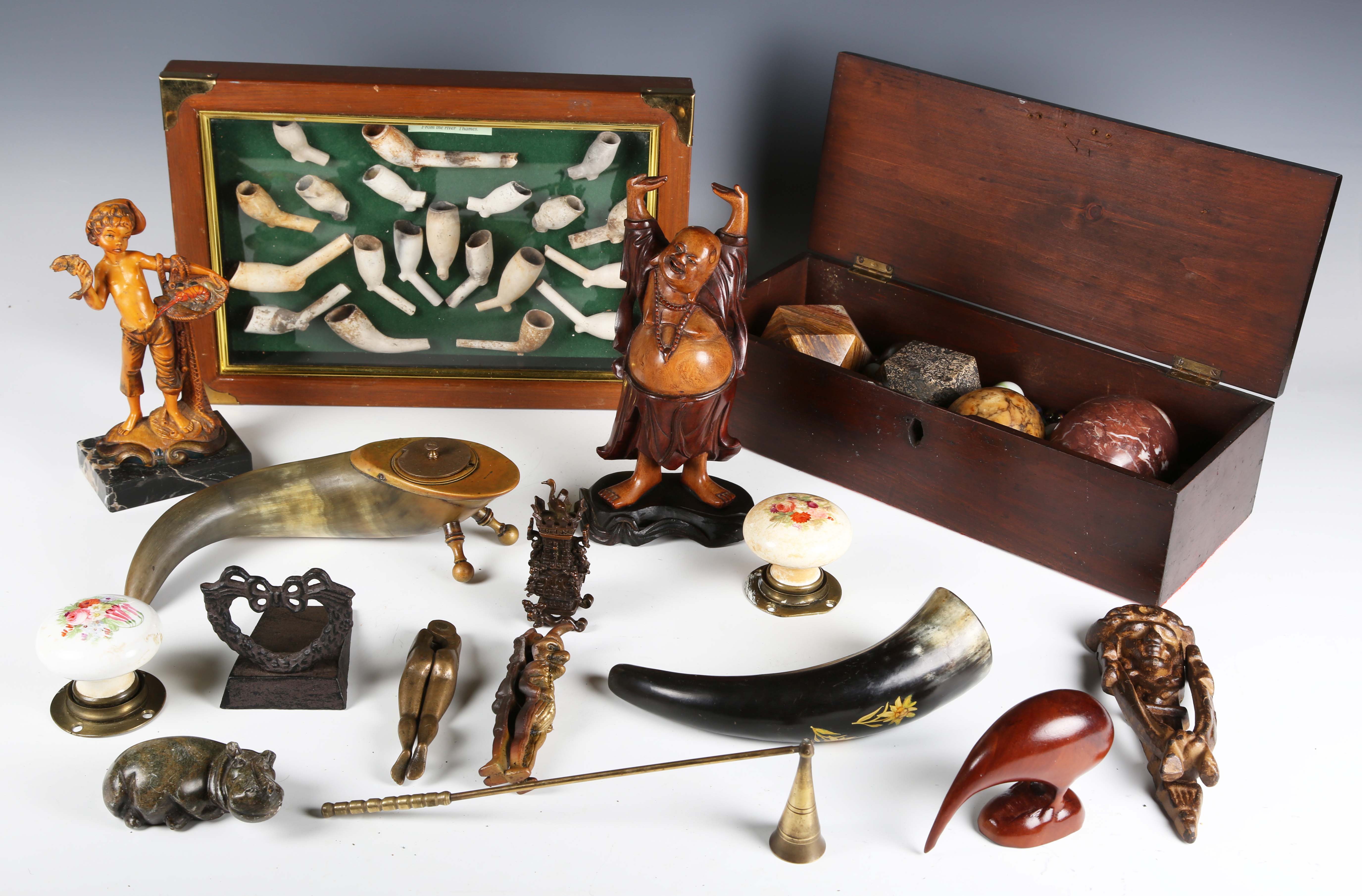 A mixed group of collectors' items, including a brass mounted horn inkwell, a small Chinese bronze urn and cover, height 9.5cm, a group of clay pipes and four hardstone specimens.