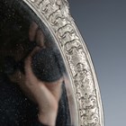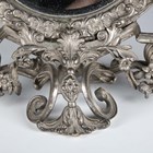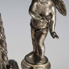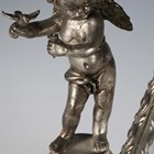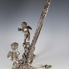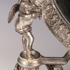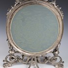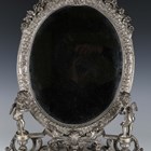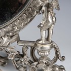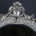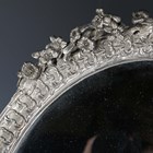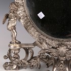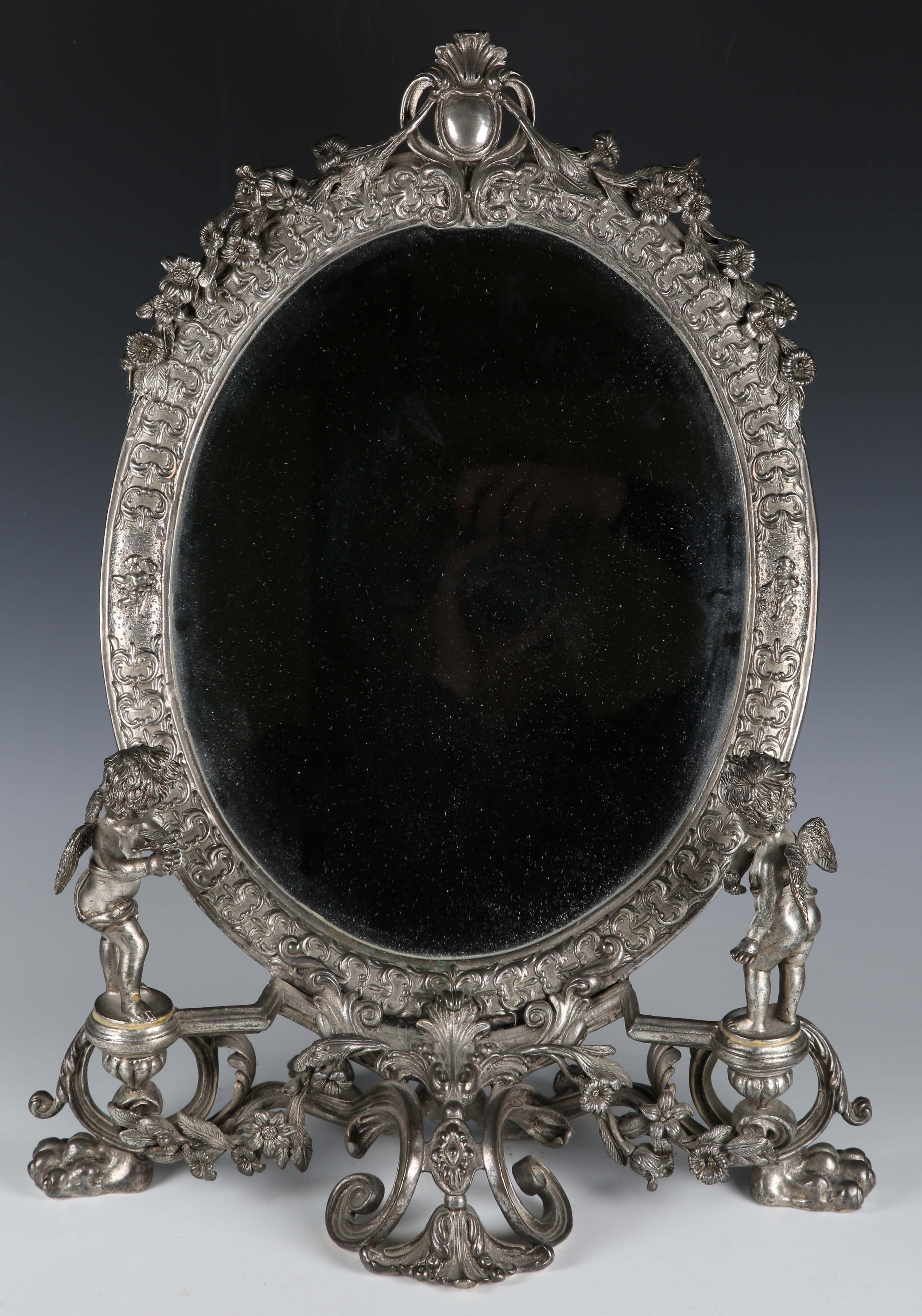 A late 20th century plated cast metal dressing table mirror, the oval frame flanked by a pair of standing cherub surmounts, height 54cm, width 41cm.