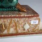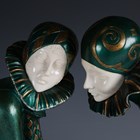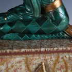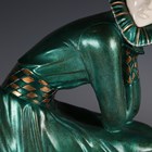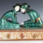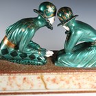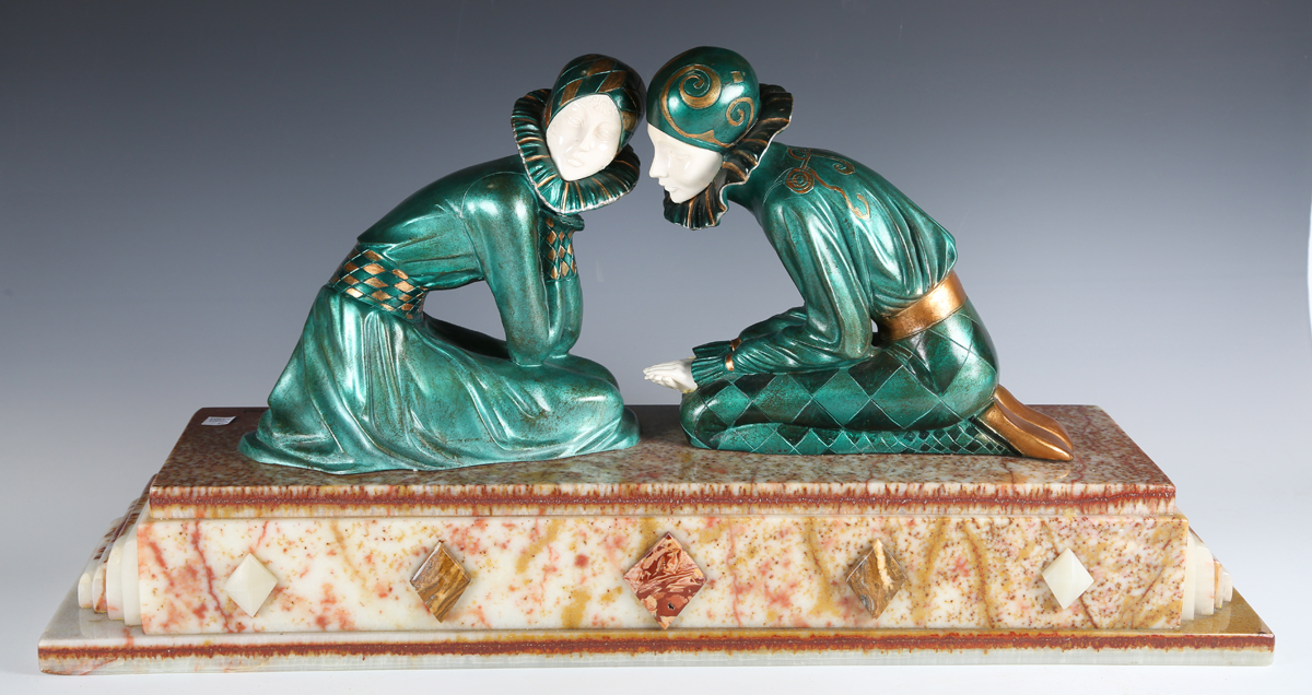 After Dimitri Chiparus - Tender Promises, a modern green and gilt patinated cast bronze and resin figure group of two kneeling lovers, the onyx base bearing facsimile signature, width 74cm.