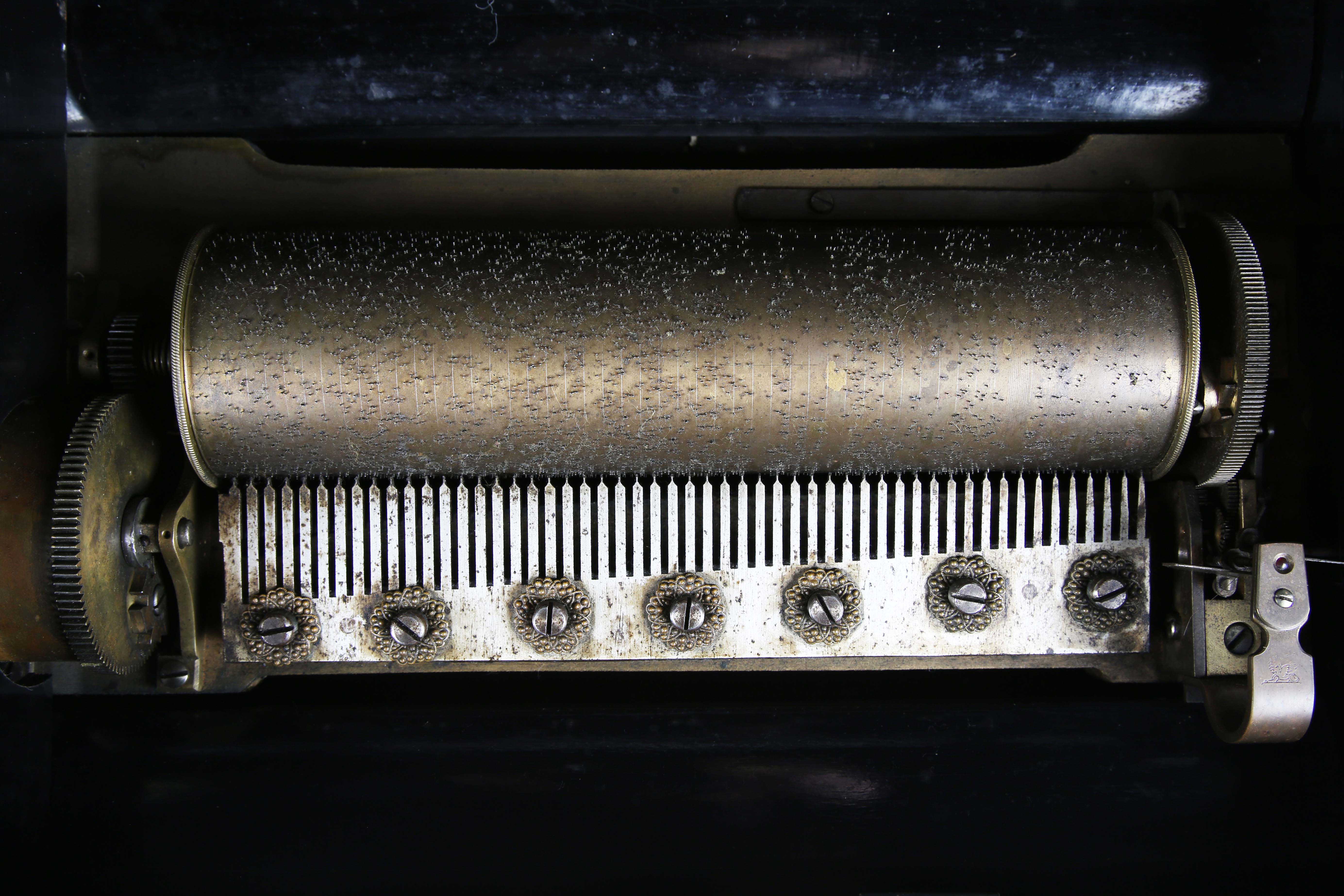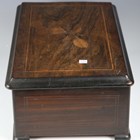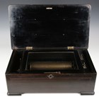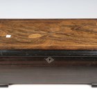 A 19th century Swiss music box, the lever-wind mechanism playing on a 24cm cylinder, within a rosewood and simulated wooden case, width 49cm.