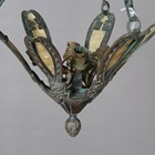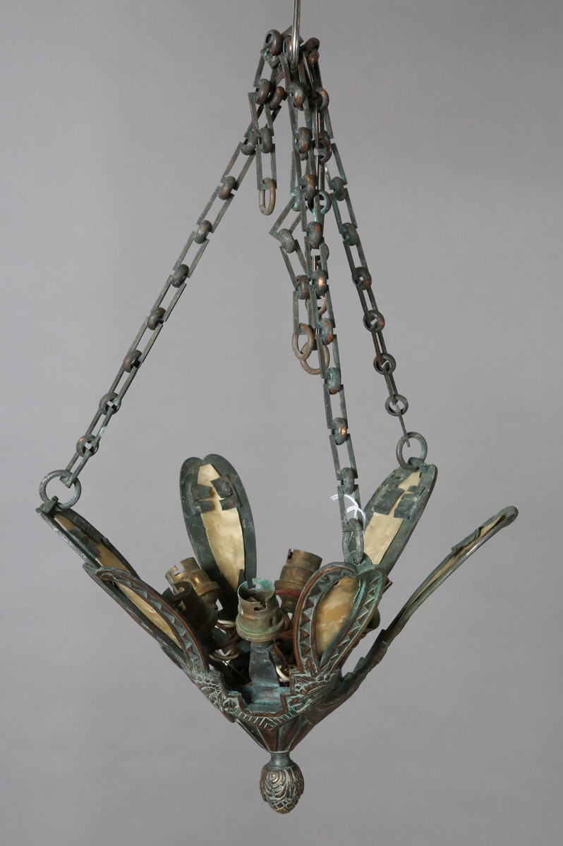 An Art Deco anodized copper hexagonal ceiling light frame, width 32cm (lacking panels).