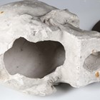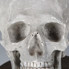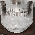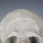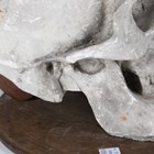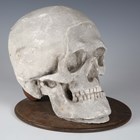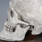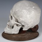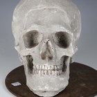 A late 20th century cast plaster model of a human skull, raised on a wooden plinth, length 27cm.
