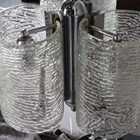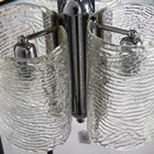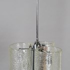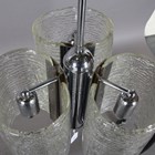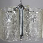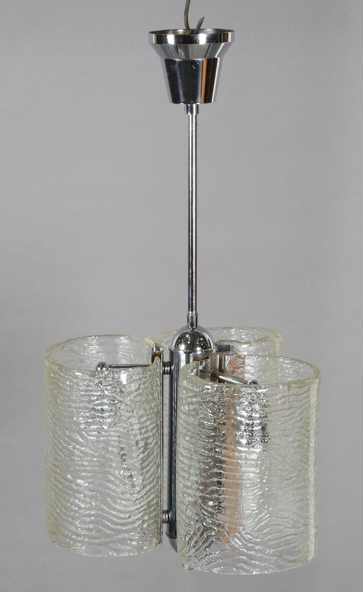 A mid-20th century moulded clear glass and chromium plated ceiling light, probably by Kalmar, fitted with three Murano glass shades, height 69cm, width 36cm.