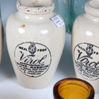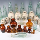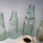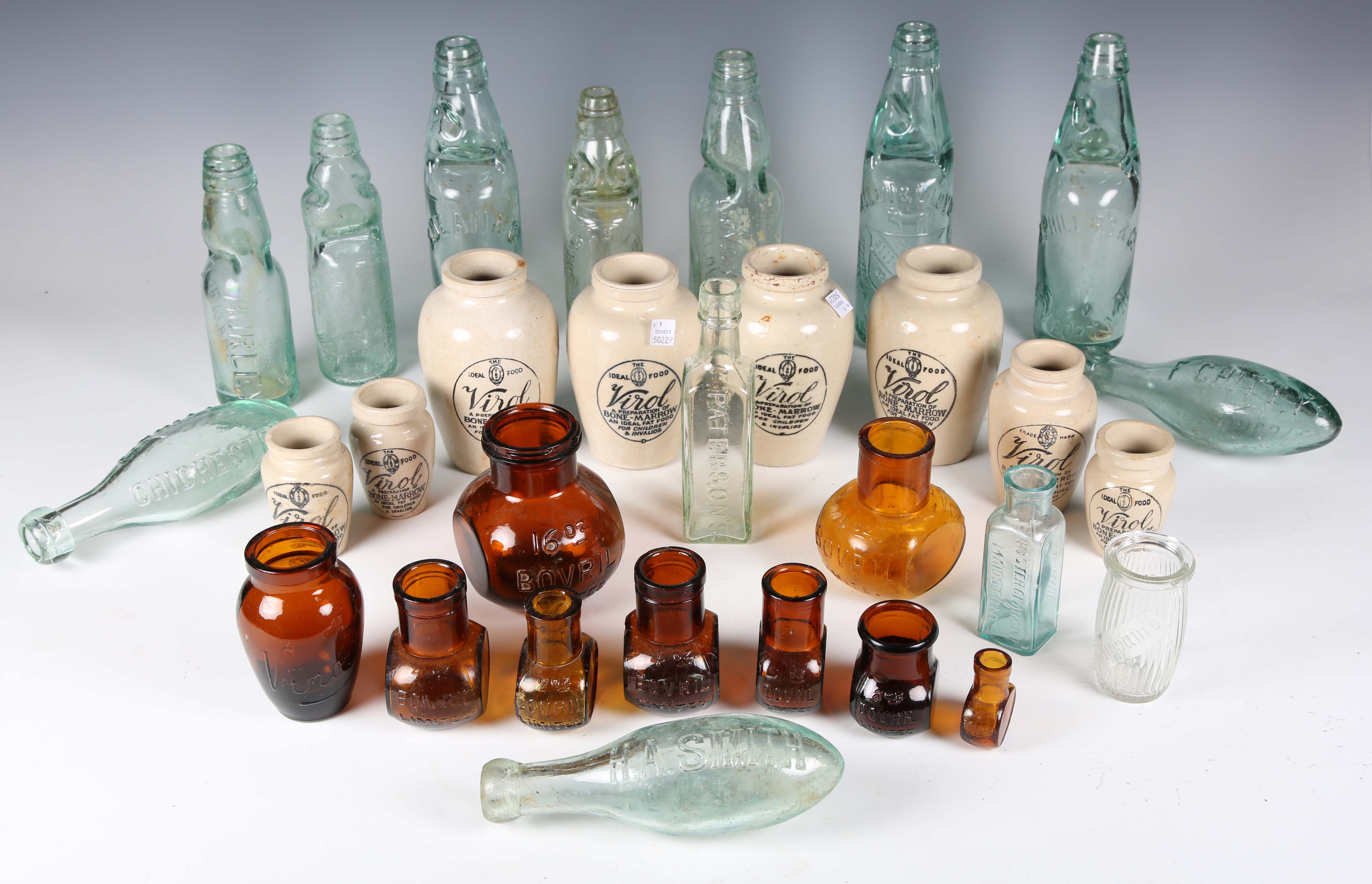 A small collection of late 19th/early 20th century mineral water bottles, including Codd and Hamilton types, together with a small group of transfer printed stoneware 'Virol' pots.