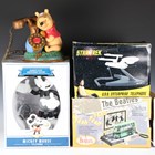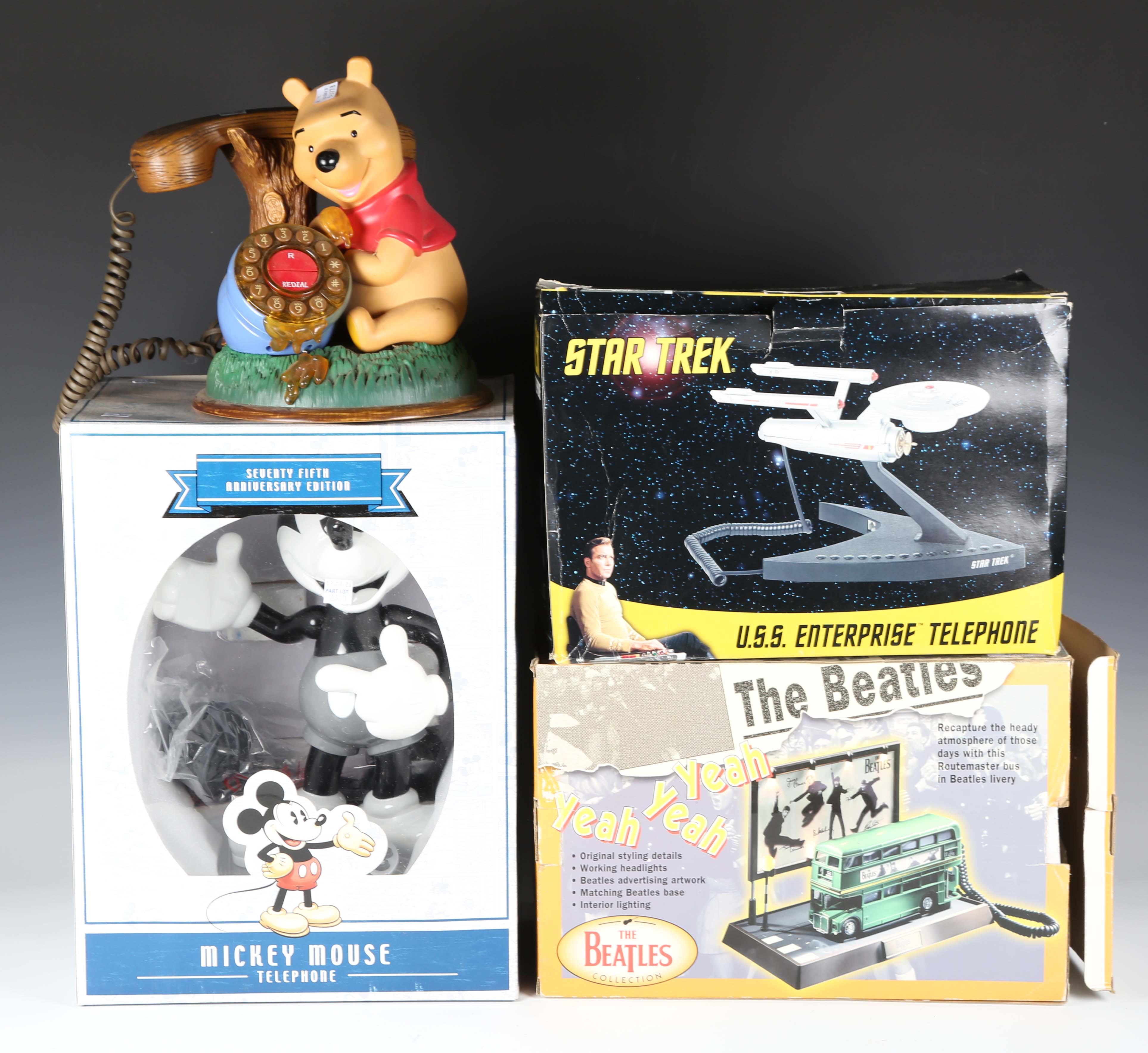 A group of four modern novelty telephones, comprising The Beatles bus, Star Trek U.S.S. Enterprise, Mickey Mouse and Winnie the Pooh.
