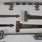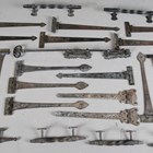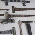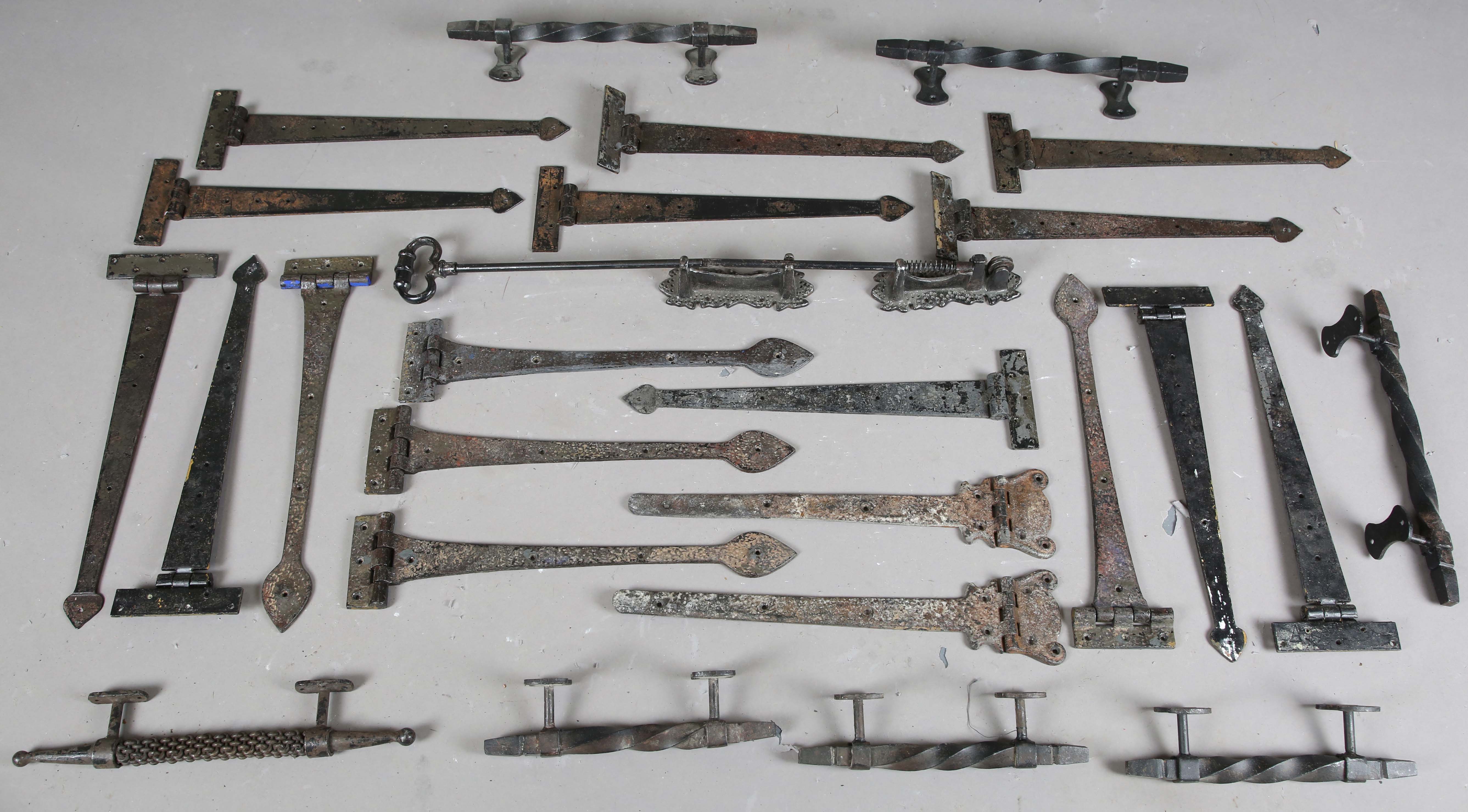 A group of 19th century and later cast iron wall brackets, door handles, hinges and a bell pull.