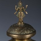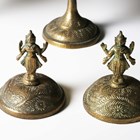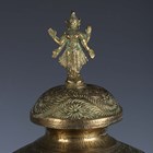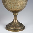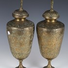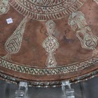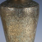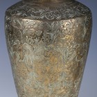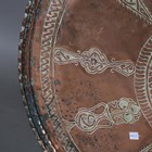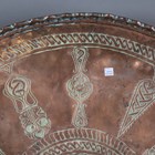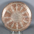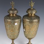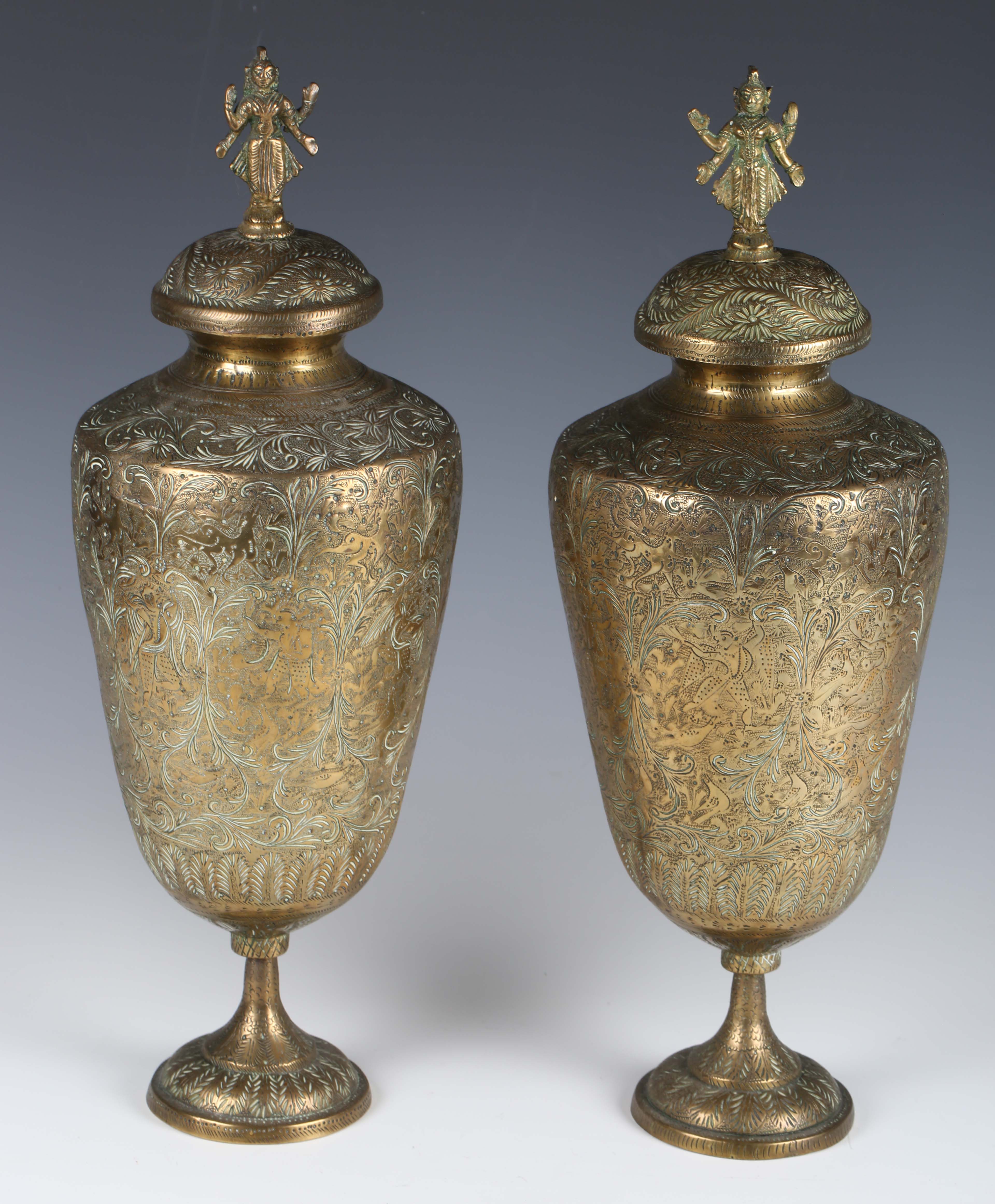 A pair of Indian brass jars and covers, the ovoid bodies engraved with figures and foliage, height 42cm, together with a large Eastern copper charger, diameter 80cm.