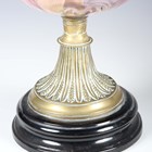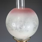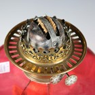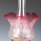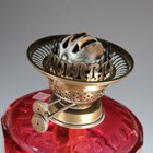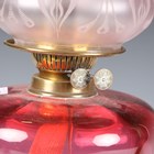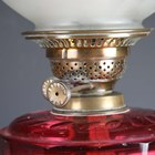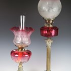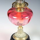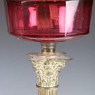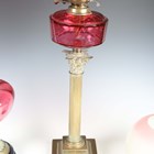 A late Victorian brass Corinthian column table oil lamp with a cranberry cut glass reservoir, height to burner 57cm, together with a brass and cranberry glass oil lamp with Art Nouveau shade.