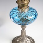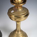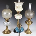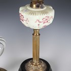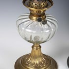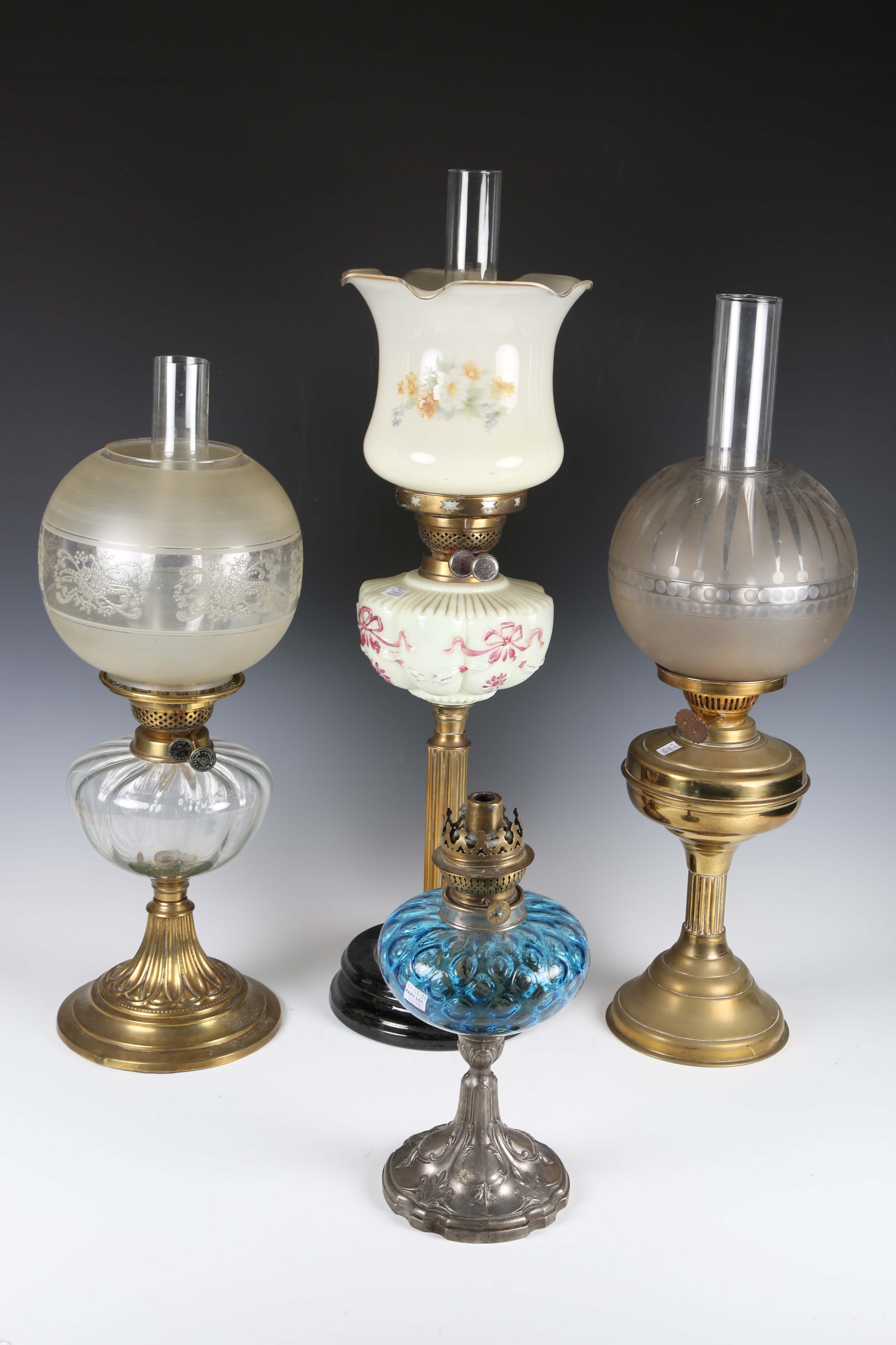 A late Victorian brass and clear glass table oil lamp, height to burner 31cm, together with three other oil lamps.