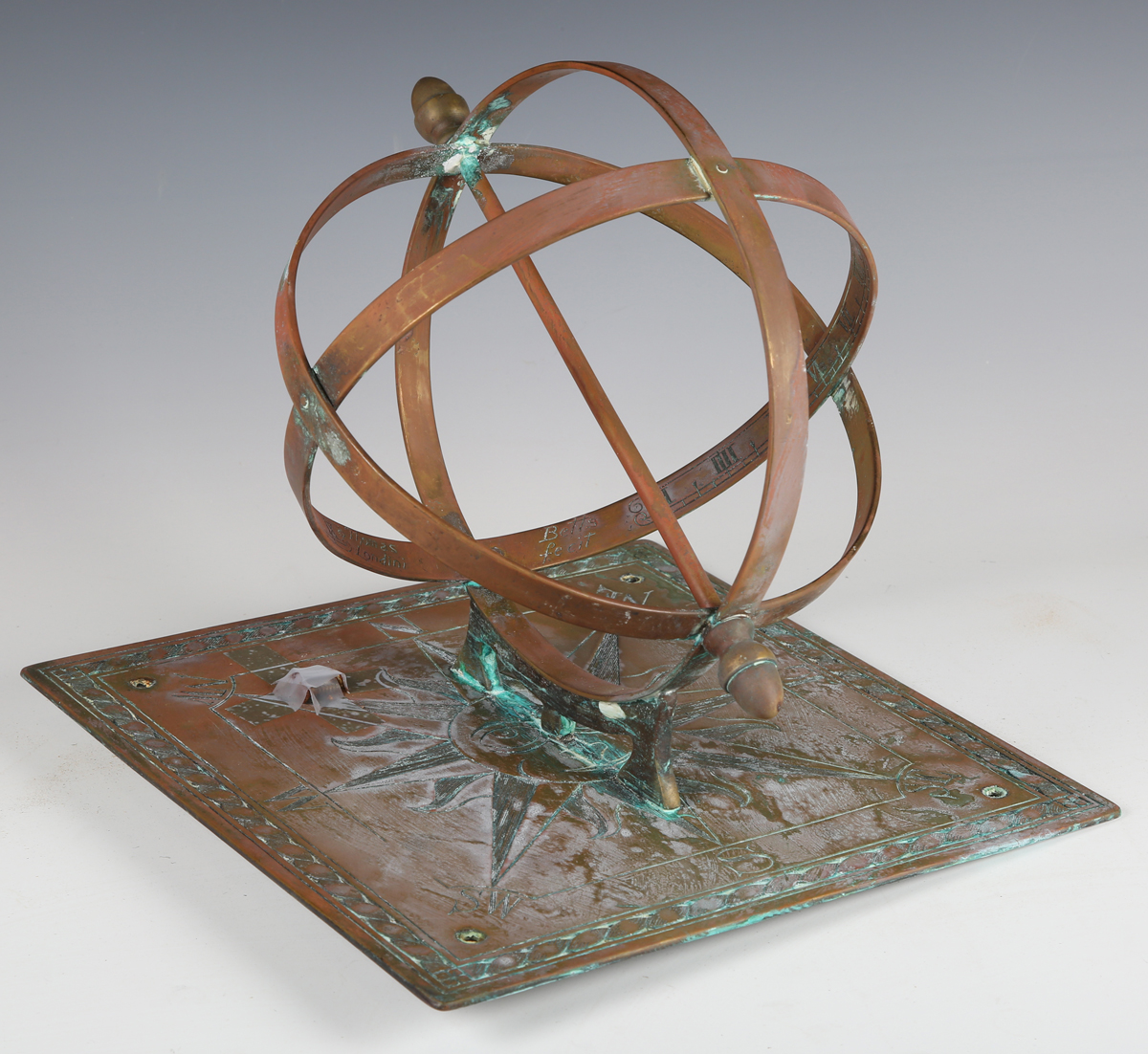 A 20th century patinated brass armillary sphere sundial, the inner border detailed 'Thomas Betts Londini', height 25cm.