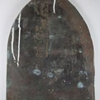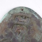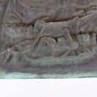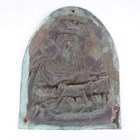 An 18th century green patinated cast metal plaque of arched form, relief decorated with the Madonna and Child, height 89cm, width 31cm.