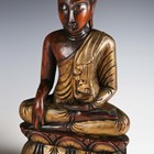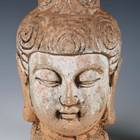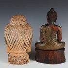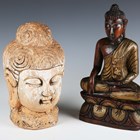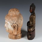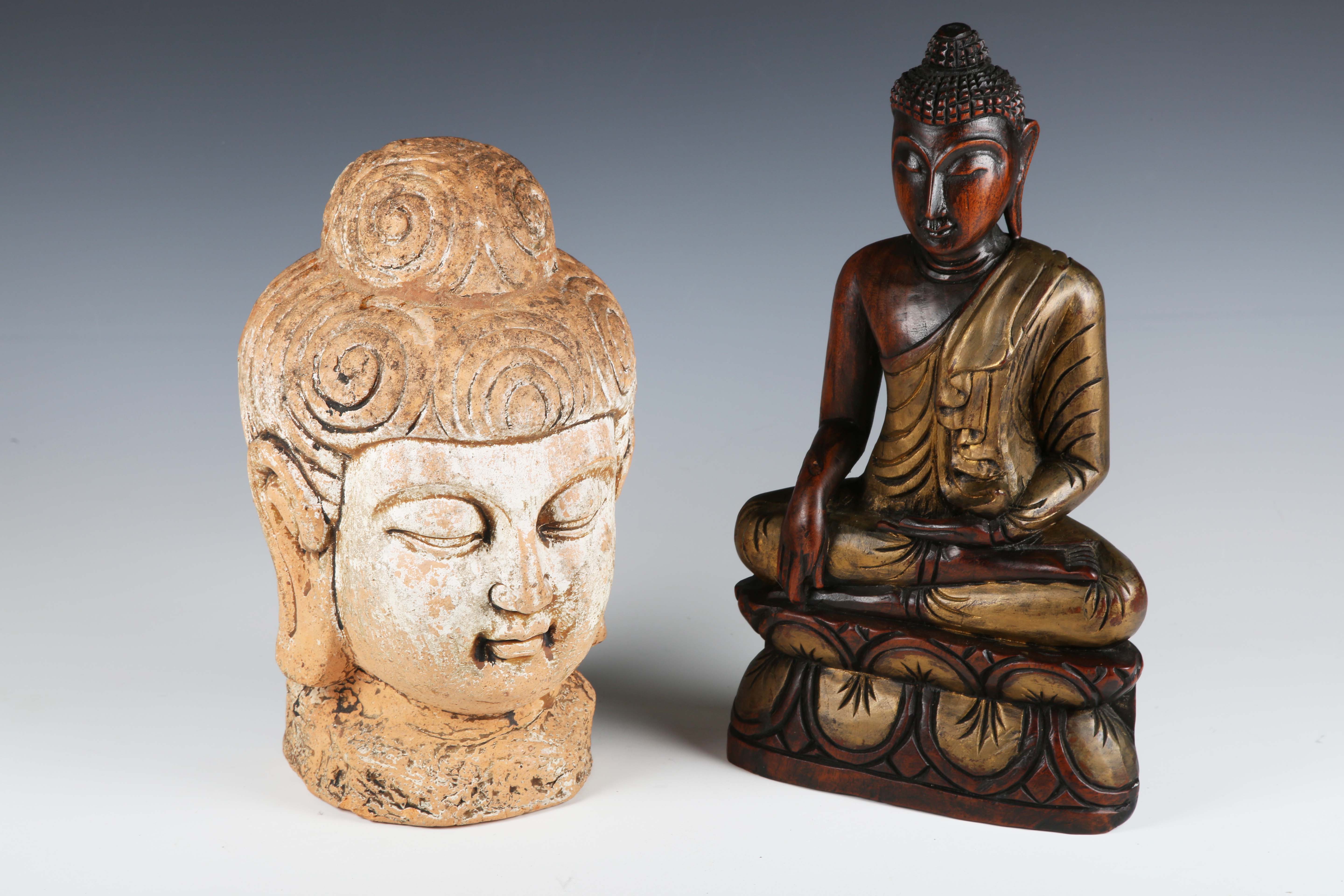 An Eastern moulded earthenware model of a Buddha's head, height 32cm, together with a carved wooden seated Buddha, height 37cm.