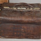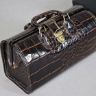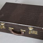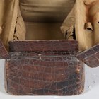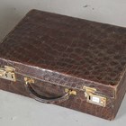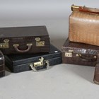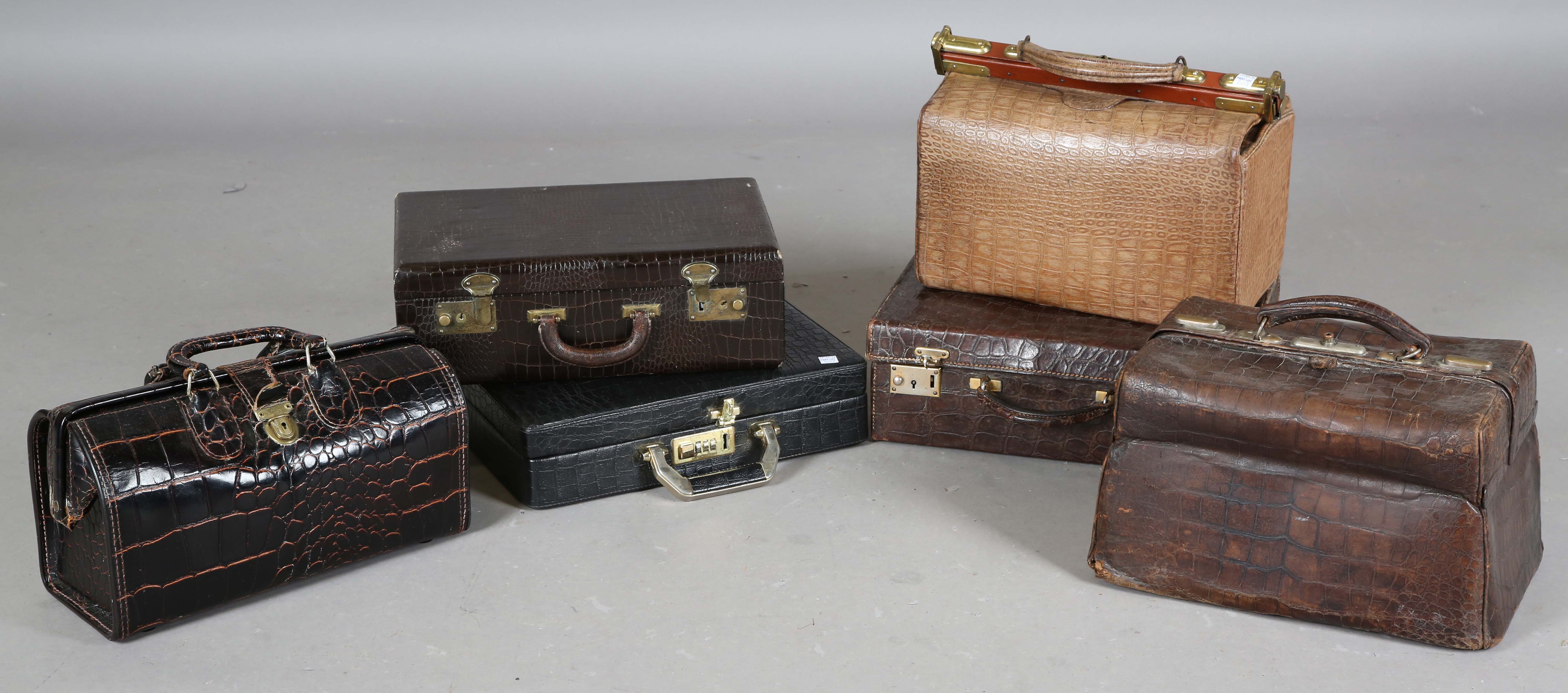 An early 20th century crocodile skin Gladstone style bag, width 36cm, another similar Gladstone bag, a small crocodile skin suitcase and three other cases.