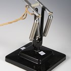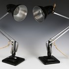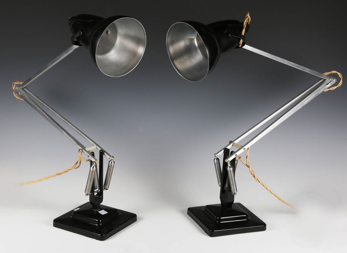 A pair of Herbert Terry black finished angle-poise table lamps with stepped square bases (refurbished).