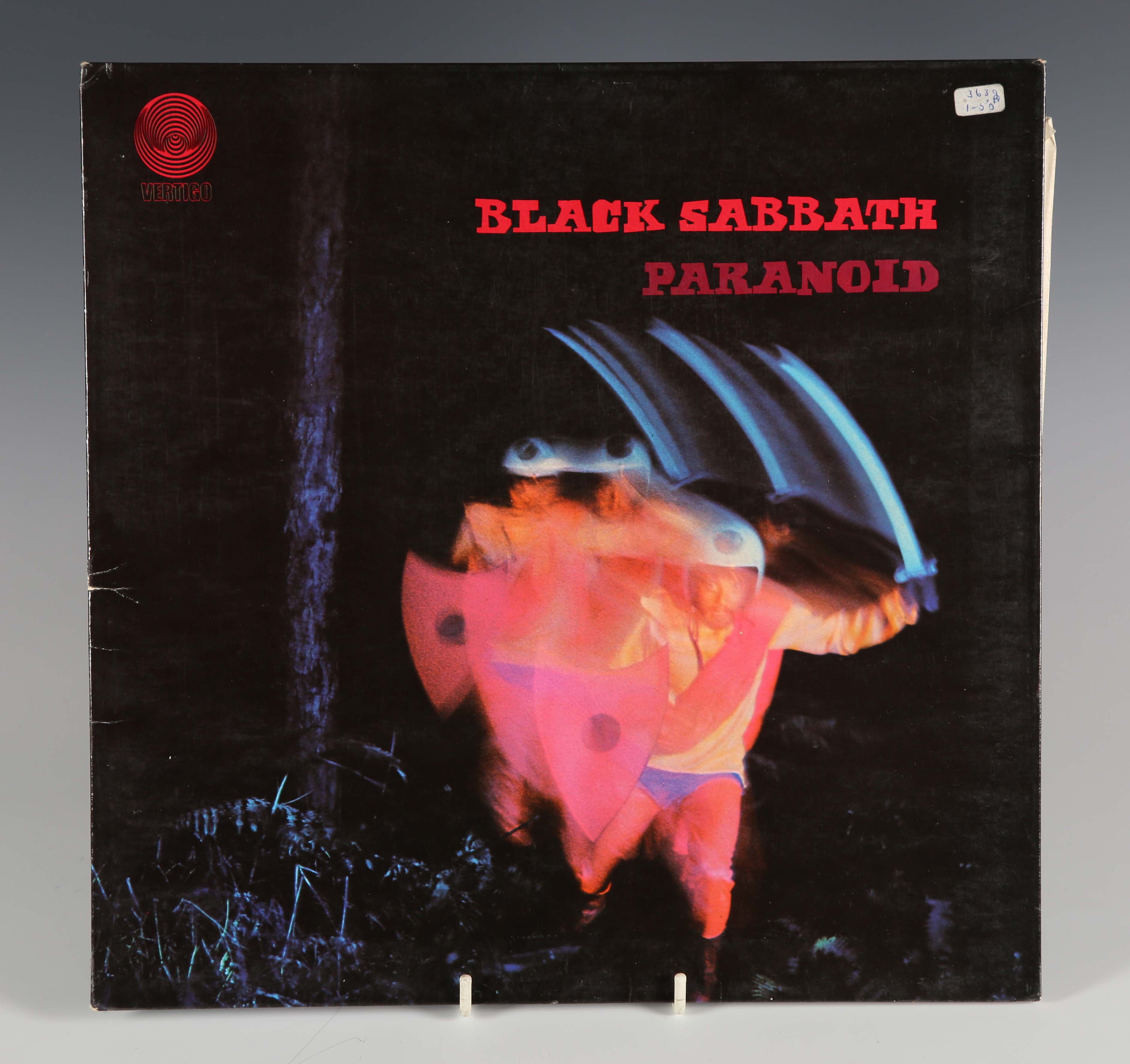 A collection of approximately fifty-four mainly rock LP records, including a Vertigo swirl second pressing of 'Paranoid' by Black Sabbath, 'Toe Fat Two', 'Charge' by Paladin, and albums by Deep Purple, Uriah Heep, Tempest, Warrior, Ten Years After, Blodwyn Pig, Blind Faith and Jethro Tull.