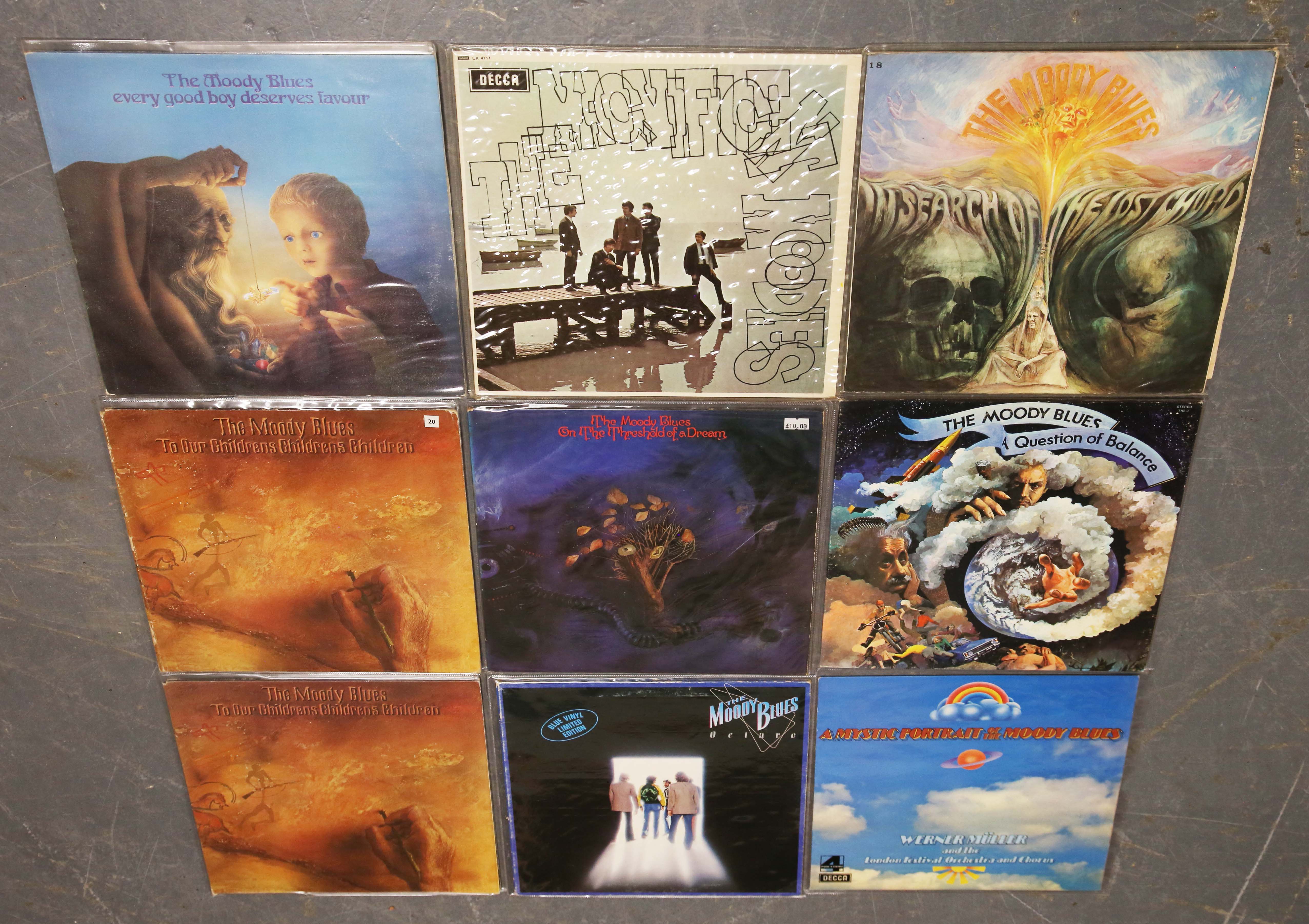 A collection of forty-two LP records by The Moody Blues, collectively and solo, including 'The Magnificent Moodies', 'On The Threshold of a Dream', 'Every Good Boy Deserves Favour', 'A Question of Balance', various issues of 'Days of Future Passed', and mono and stereo pressings of 'To Our Childrens Childrens Children'.