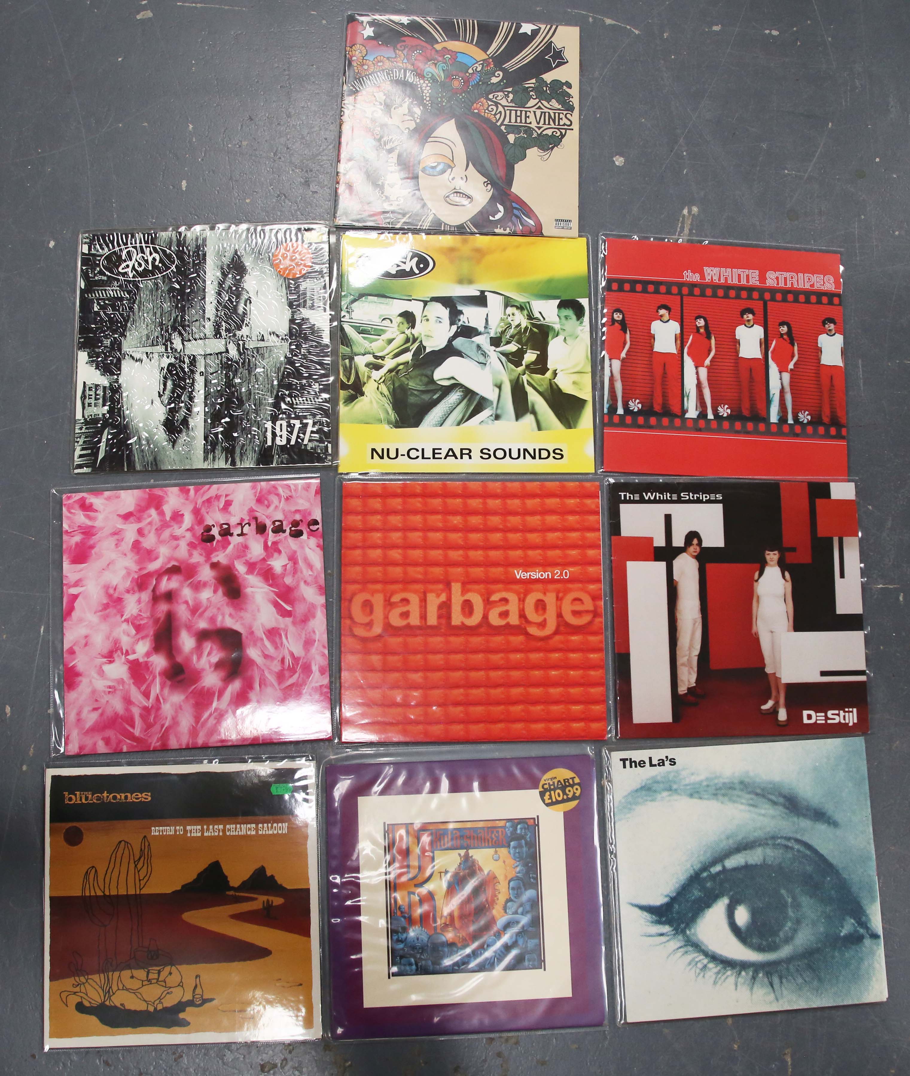 A collection of ten LP records, including a first pressing of 'K' by Kula Shaker, and early pressings of albums by The La's, The Bluetones, Ash, Garbage, The Vines and The White Stripes.