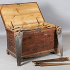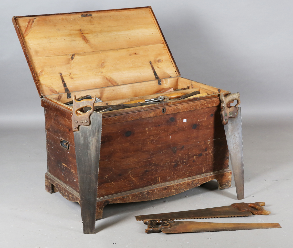 A large collection of woodworking tools, including a sash plane, other planes, gauges, saws and markers, all contained within a pine tool chest, width 94cm.