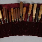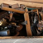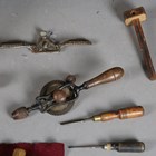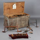 A large collection of woodworking tools, including various planes, marking gauges, saws, rulers and a band saw, all contained within a pine tool chest, width 93cm.