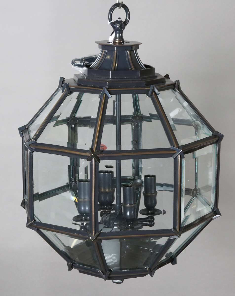 A modern anodized metal and bevelled glass four-light ceiling lantern by Eichholtz, the octagonal frame inset with clear glass, height 62cm, width 44cm.