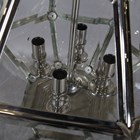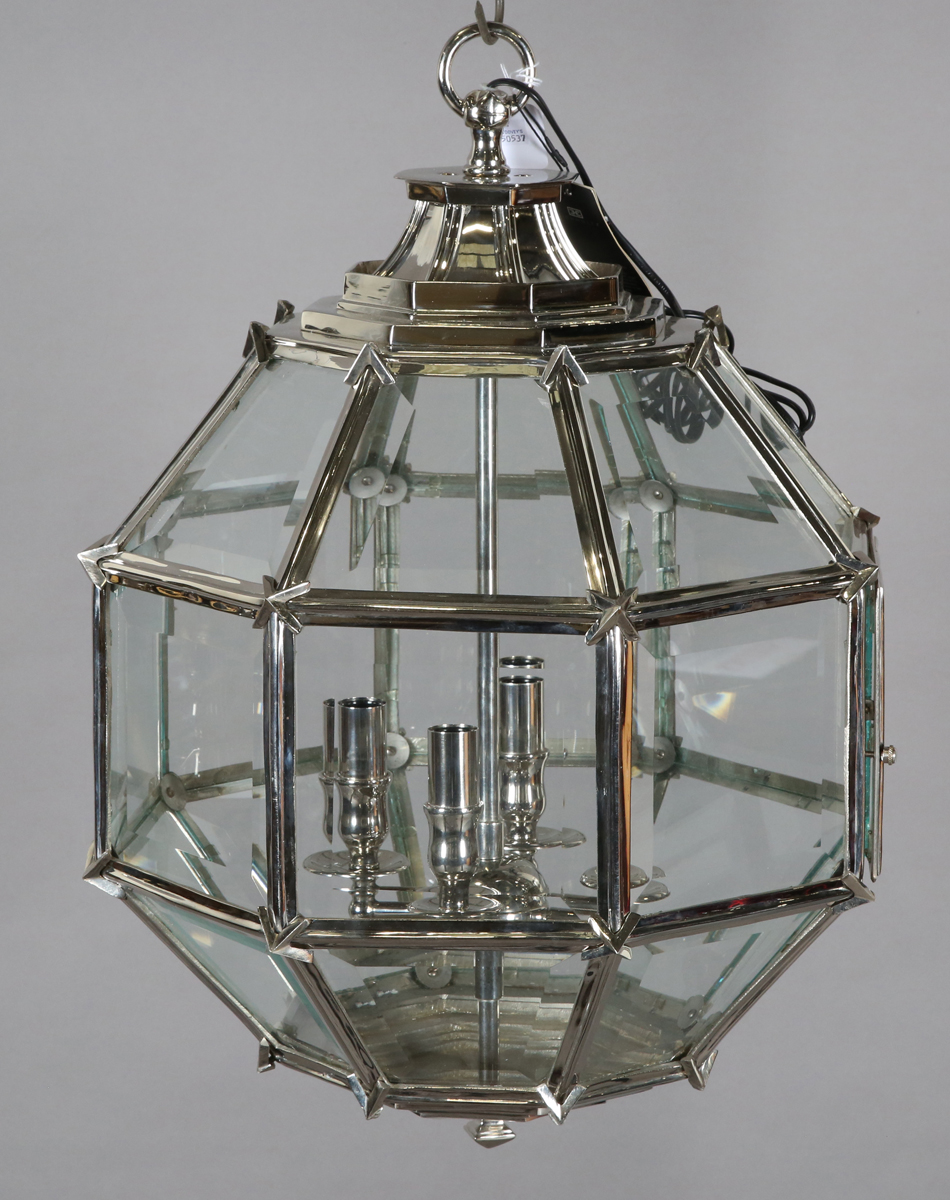 A modern nickel plated metal and bevelled glass four-light ceiling lantern by Eichholtz, the octagonal frame inset with clear glass, height 62cm, width 44cm.