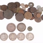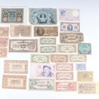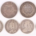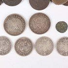 A collection of European and world coins and banknotes, including a Republic of Chile one peso 1884, Santiago Mint (good-very fine, toned), an Oriental Republic of Uruguay one peso 1877, four Victoria silver half-crowns, comprising 1887, 1888, 1894 and 1901, and a Roman Empire copper-alloy antoninianus 268-270 AD.