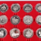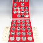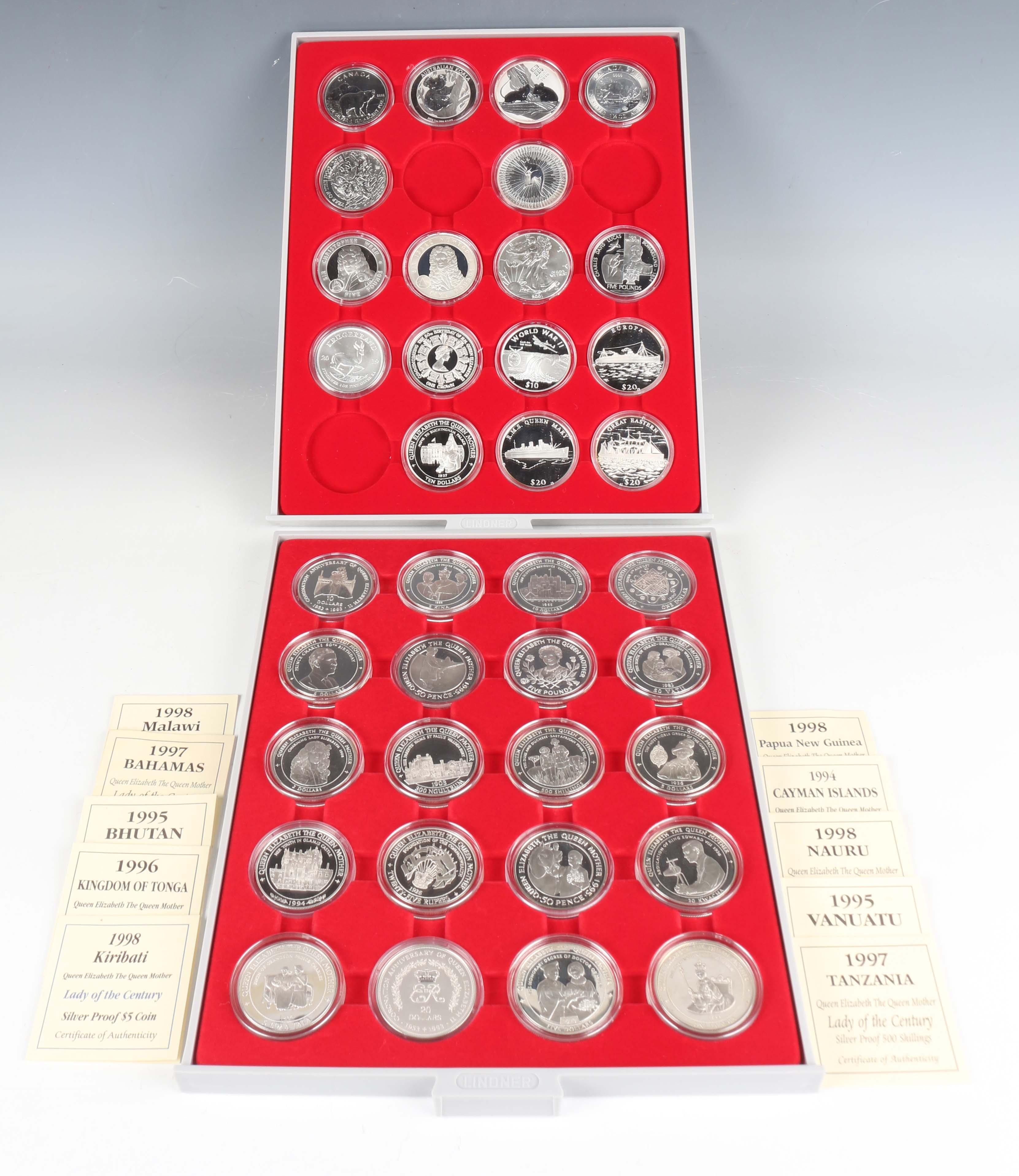 A collection of silver crown-size commemorative coins, including a group of Lady of the Century examples, together with a silver Krugerrand 2019 and a USA dollar 2001, some with certificates and displayed within two Lindner coin trays.