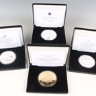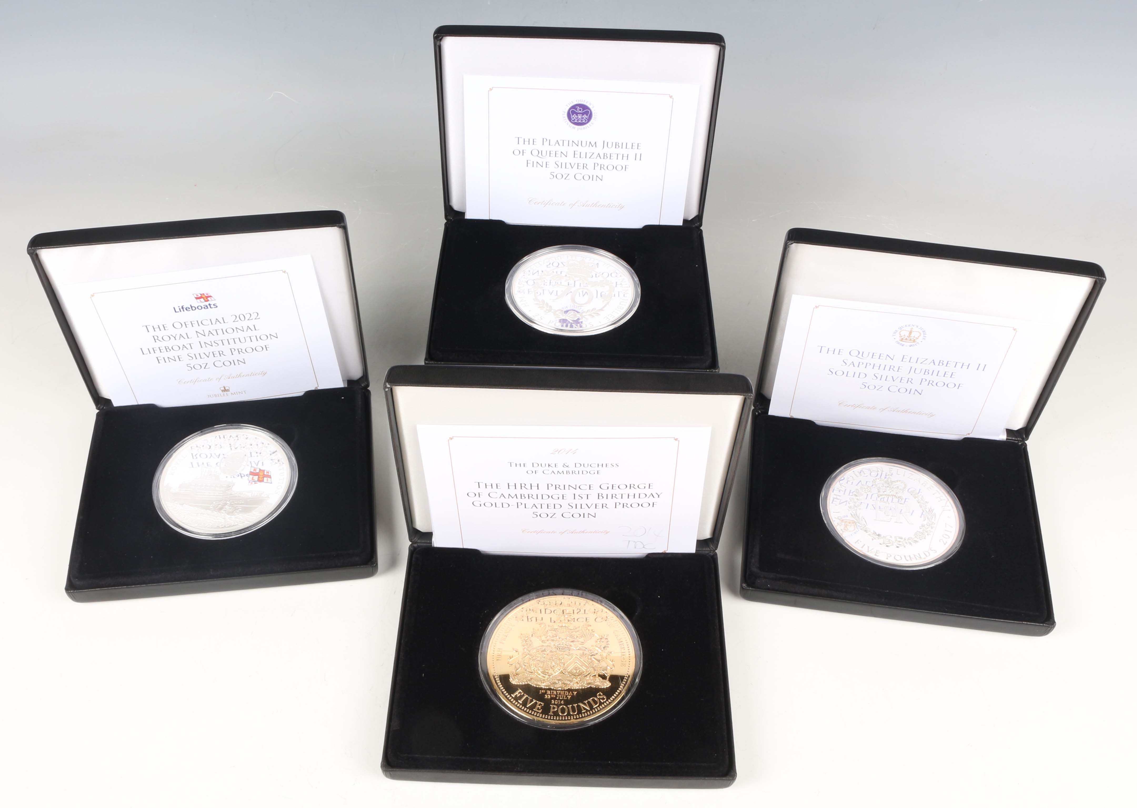 A group of four Jubilee Mint five-ounce silver proof commemorative coins, including Elizabeth II Sapphire Jubilee 2017 and HRH Prince George of Cambridge First Birthday 2014, each deluxe-cased with certificate.