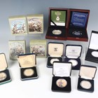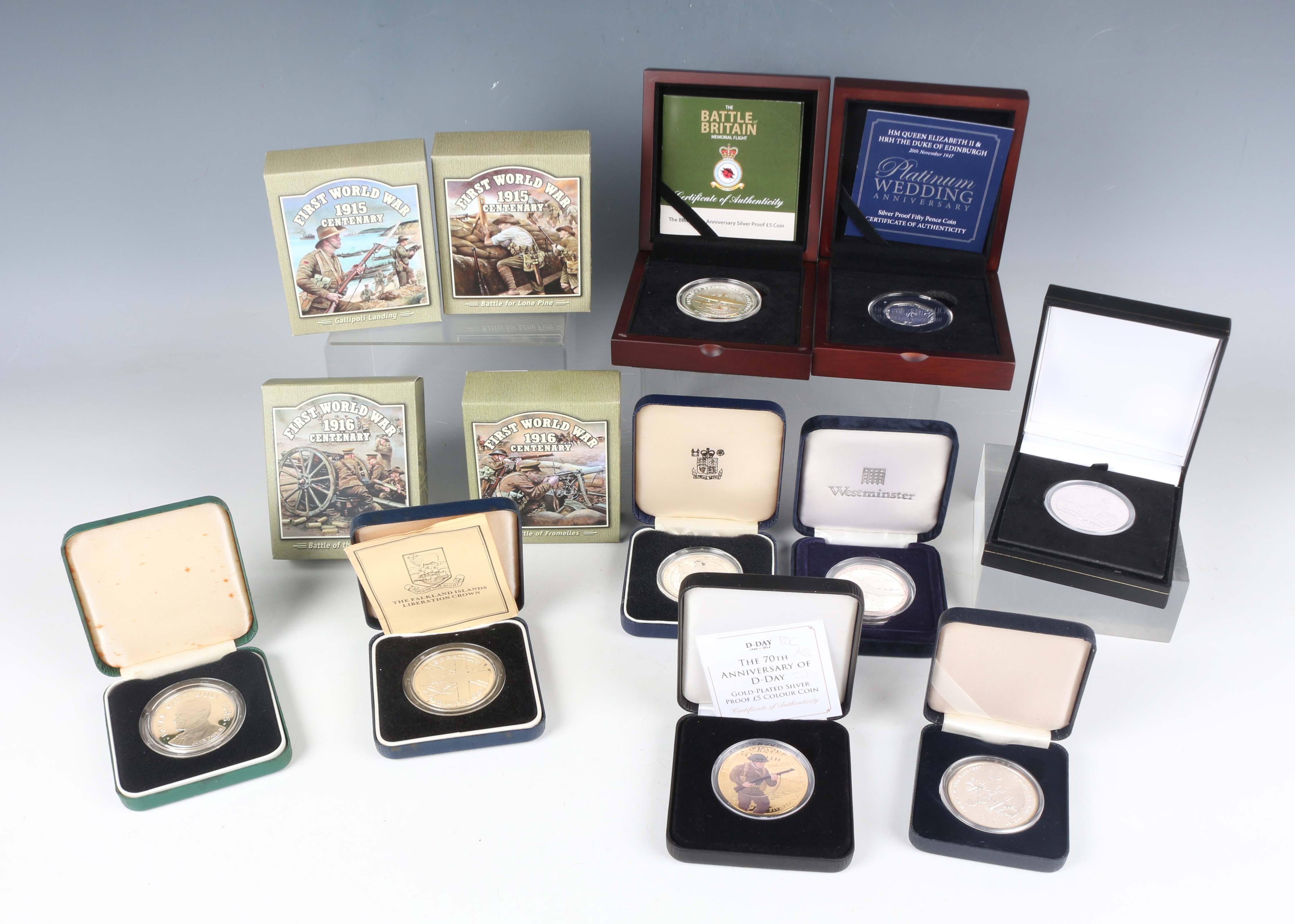 A collection of mixed world commemorative coinage, mainly silver, including a crown-size three-coin set commemorating the 80th Anniversary of the Battle of Britain, four crown-size coins remembering First World War events, comprising the Gallipoli landing, the Battle of Fromelles, the Battle of the Somme and the Battle for Lone Pine, and a London Mint Office silver ten dollars commemorating the Battle of Trafalgar, together with a small group of base metal commemorative coins, most cased with certificates.