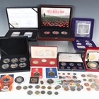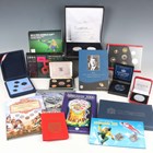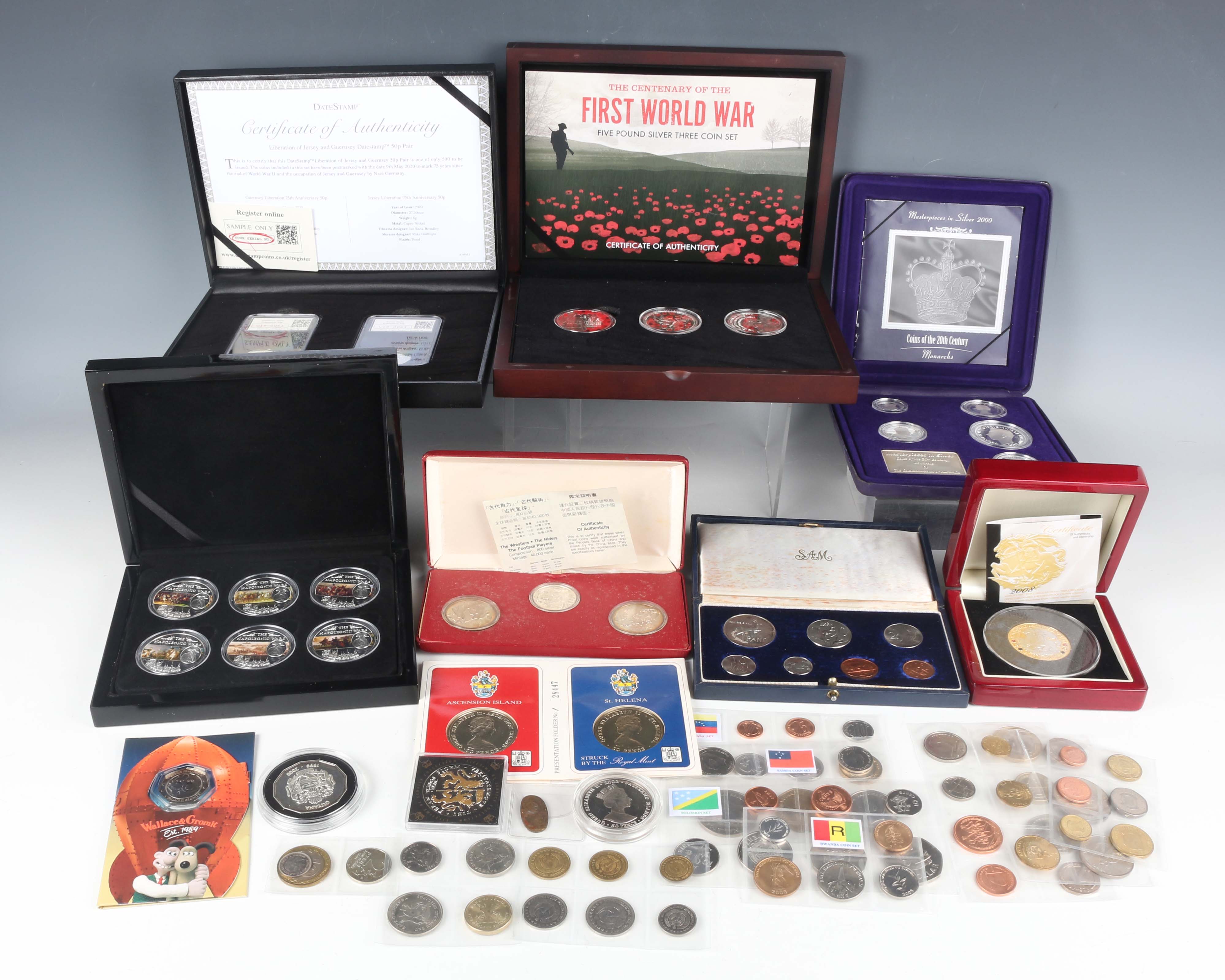 A collection of world silver and base metal commemorative coinage, including a Royal Australian Mint silver five-coin set celebrating monarchs of the Commonwealth of Australia, two DateStamp cupro-nickel proof fifty pences celebrating the Liberation of Jersey and Guernsey, each slabbed, and a People's Bank of China silver three-coin set celebrating wrestlers, riders and footballers.