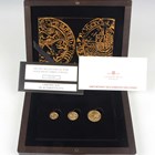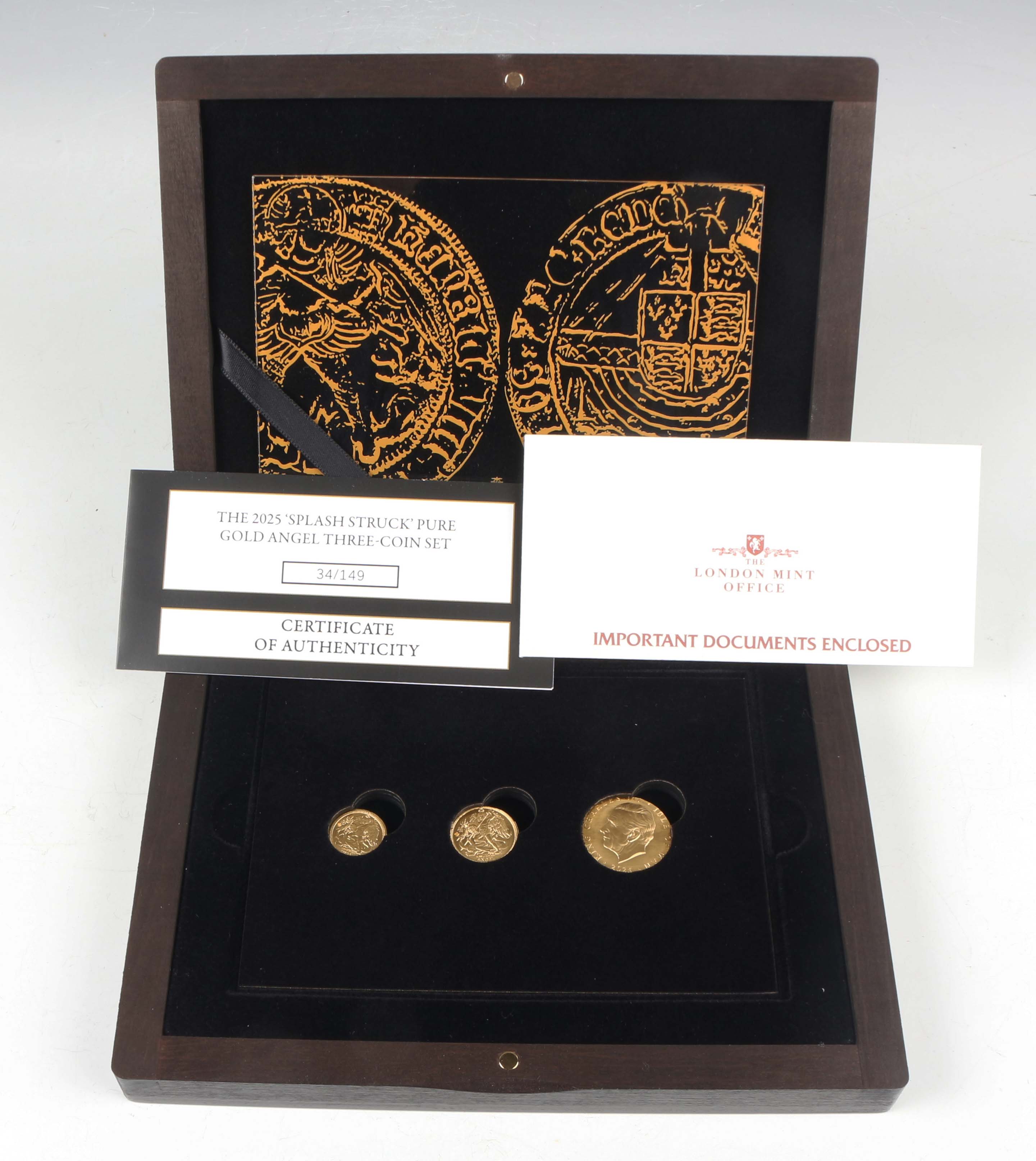 A Charles III London Mint Office 'Splash Struck' gold angel three-coin set 2025, each reverse with Saint Michael slaying dragon, deluxe-cased with certificate, No. 34/149. Note: this lot includes an HMRC?classified investment gold coin and is sold under standard VAT (not margin scheme). The hammer price is VAT?exempt. VAT is charged only on the Buyer’s Premium, shown separately, and may be recoverable depending on the buyer’s VAT status.