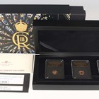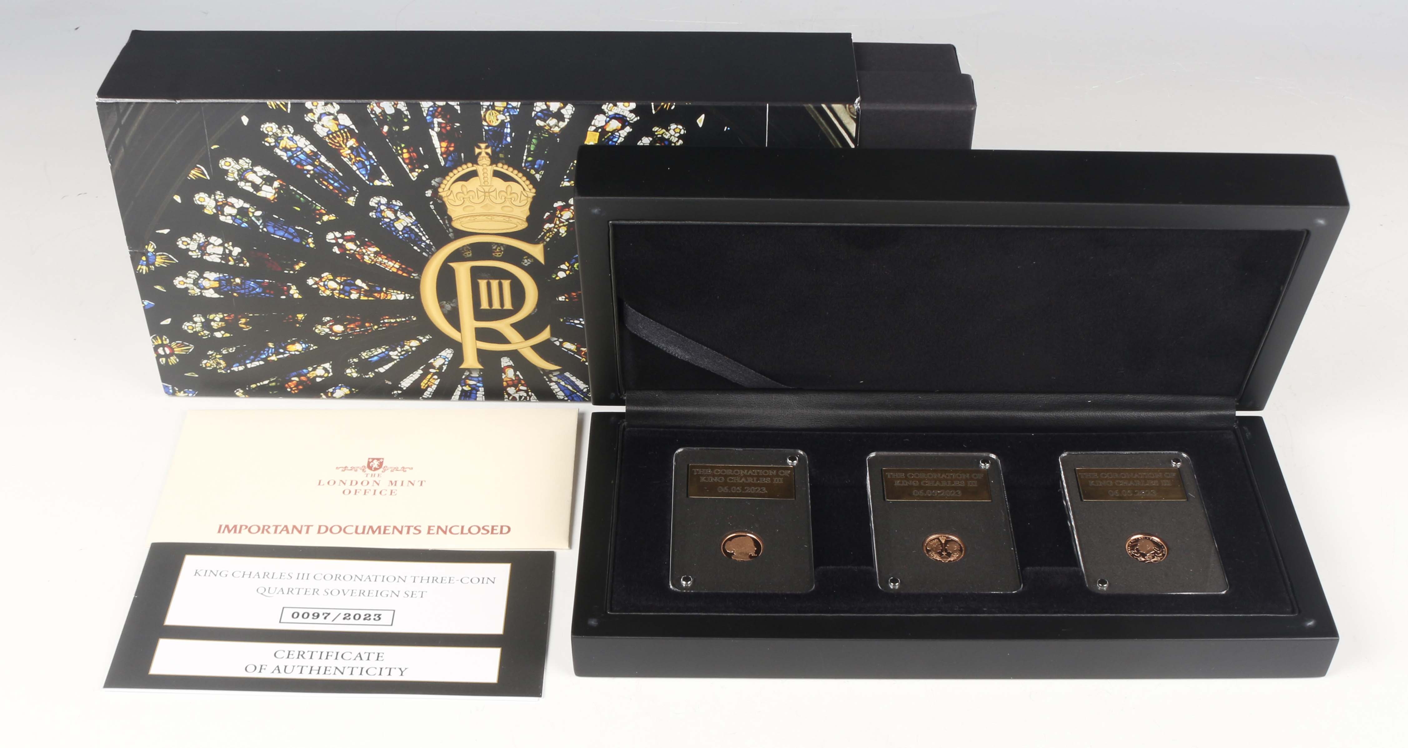 A Charles III London Mint Office quarter-sovereign three-coin set 2023 commemorating Charles' coronation, each slabbed, deluxe-cased with certificate, No. 0097/2023. Note: this lot includes an HMRC?classified investment gold coin and is sold under standard VAT (not margin scheme). The hammer price is VAT?exempt. VAT is charged only on the Buyer’s Premium, shown separately, and may be recoverable depending on the buyer’s VAT status.