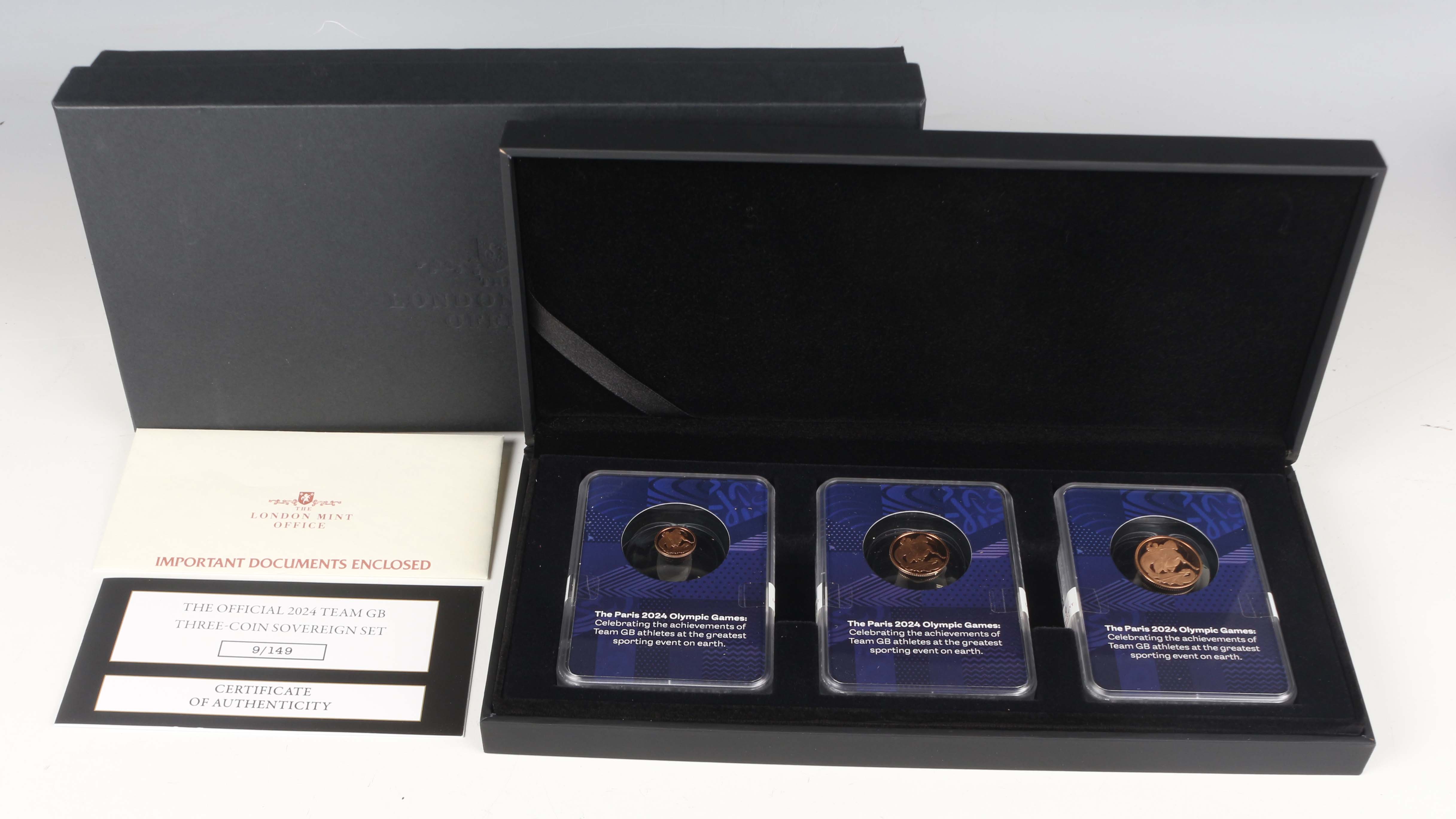 A Charles III London Mint Office sovereign three-coin set 2024 celebrating Team GB, Paris Olympic Games, each slabbed, deluxe-cased with certificate, No. 9/149. Note: this lot includes an HMRC?classified investment gold coin and is sold under standard VAT (not margin scheme). The hammer price is VAT?exempt. VAT is charged only on the Buyer’s Premium, shown separately, and may be recoverable depending on the buyer’s VAT status.