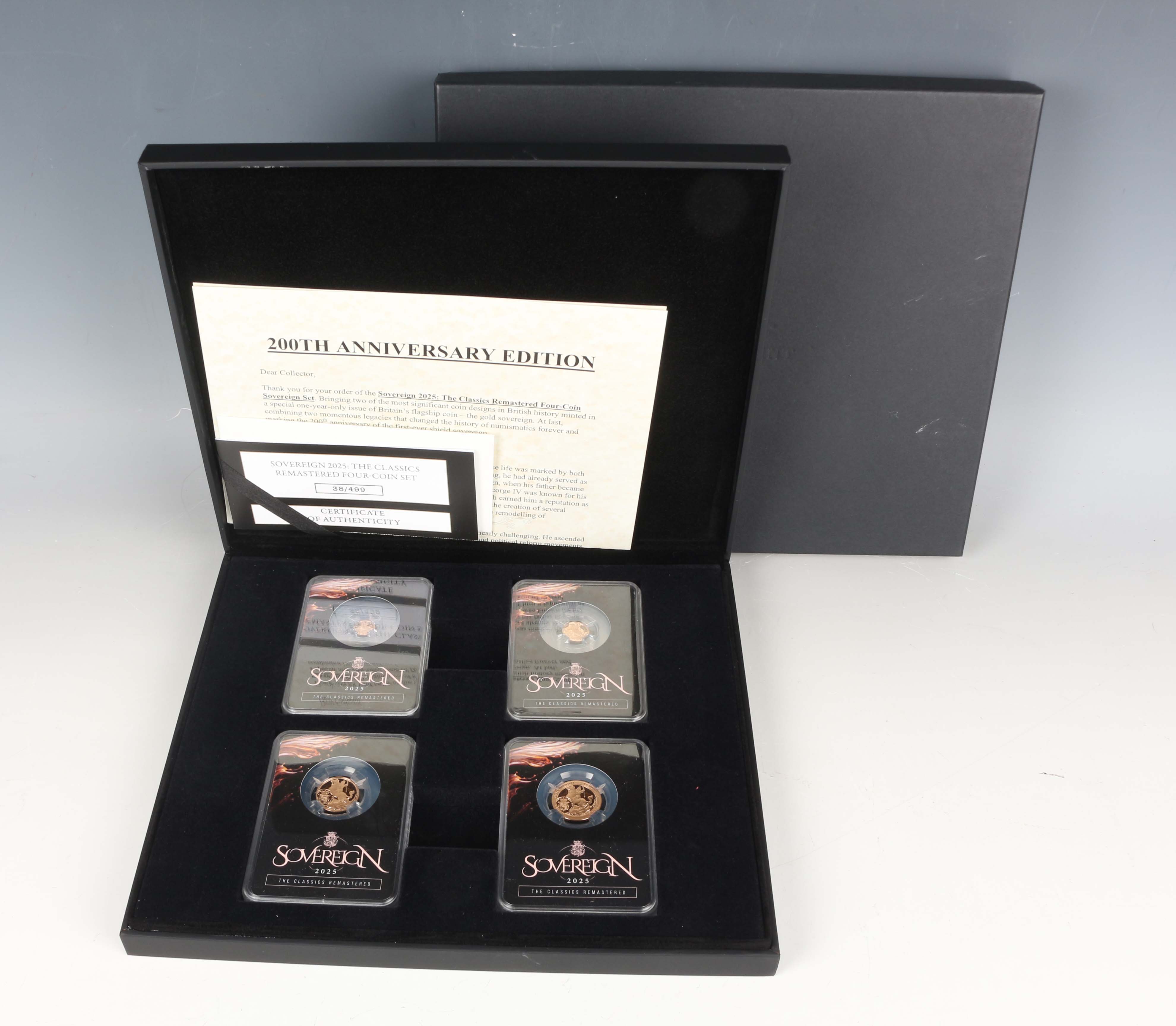 A Charles III London Mint Office The Classics Remastered gold four-coin presentation set 2025 celebrating the sovereign, each slabbed, deluxe-cased with certificate, No. 38/499. Note: this lot includes an HMRC?classified investment gold coin and is sold under standard VAT (not margin scheme). The hammer price is VAT?exempt. VAT is charged only on the Buyer’s Premium, shown separately, and may be recoverable depending on the buyer’s VAT status.