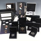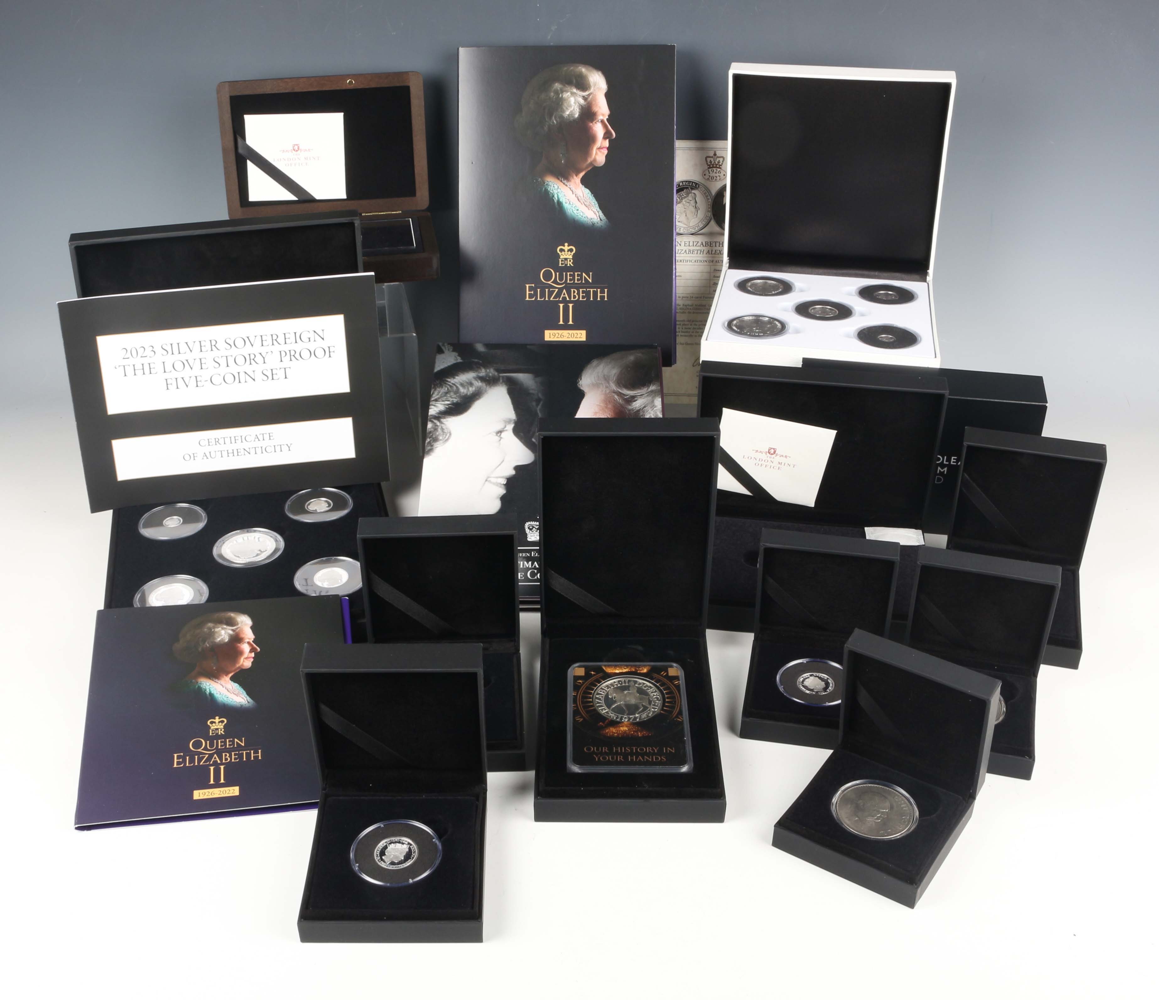 A collection of London Mint Office silver and base metal commemorative coinage, including an Elizabeth II Forever The First Silver Sovereign five-coin set 2019, an Elizabeth II silver proof crown 2022 and a Charles III 'Splash Struck' one-ounce silver angel 2025, the majority cased with certificates.