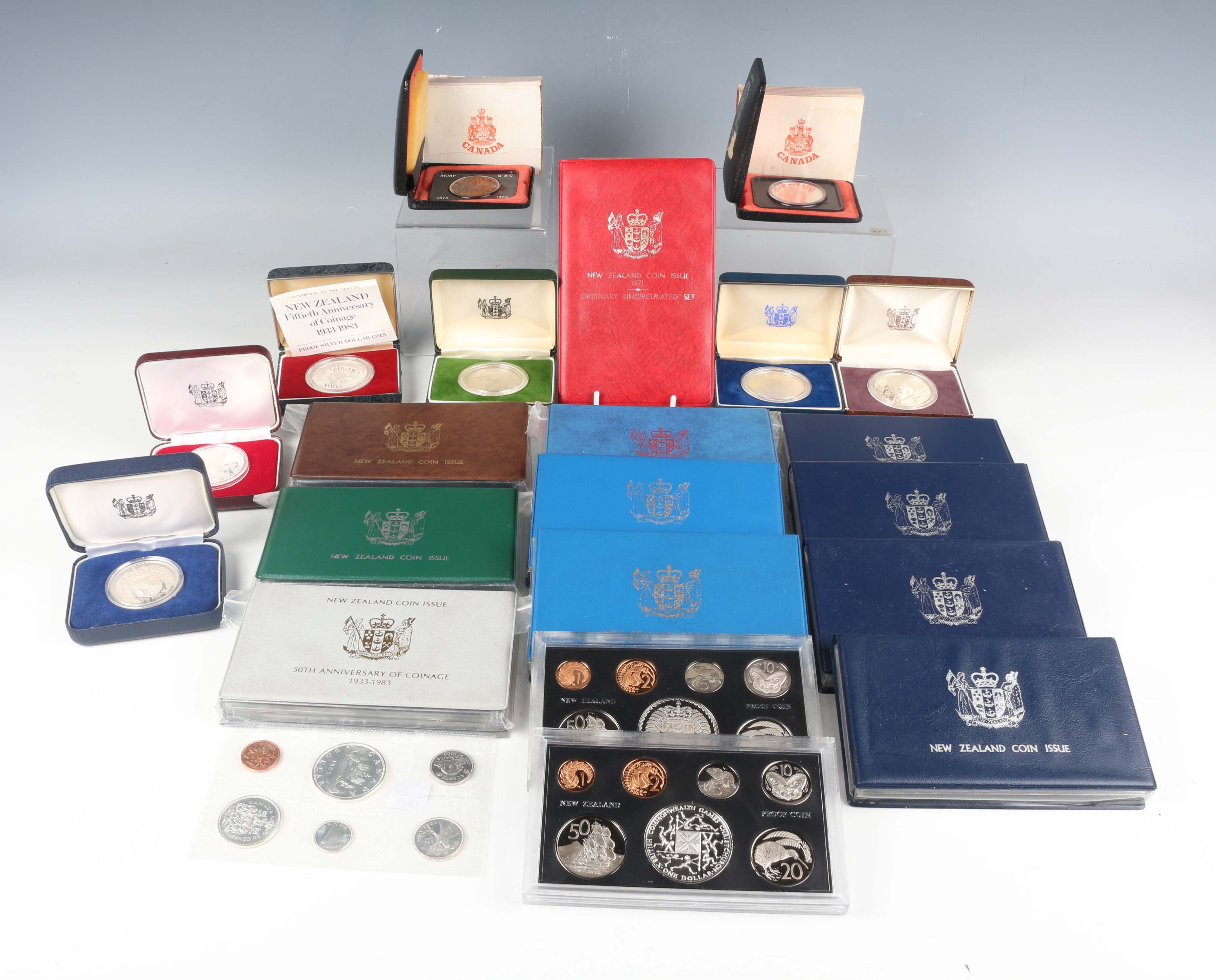 A large collection of New Zealand and Canadian silver and base metal commemorative coinage, including a group of New Zealand year-type sets, comprising 1972, 1973, 1974, 1975, 1976, 1977, 1978, 1979, 1980, 1981, 1982 and 1983, a Canada six-coin set 1965 and two Canada silver dollars.