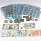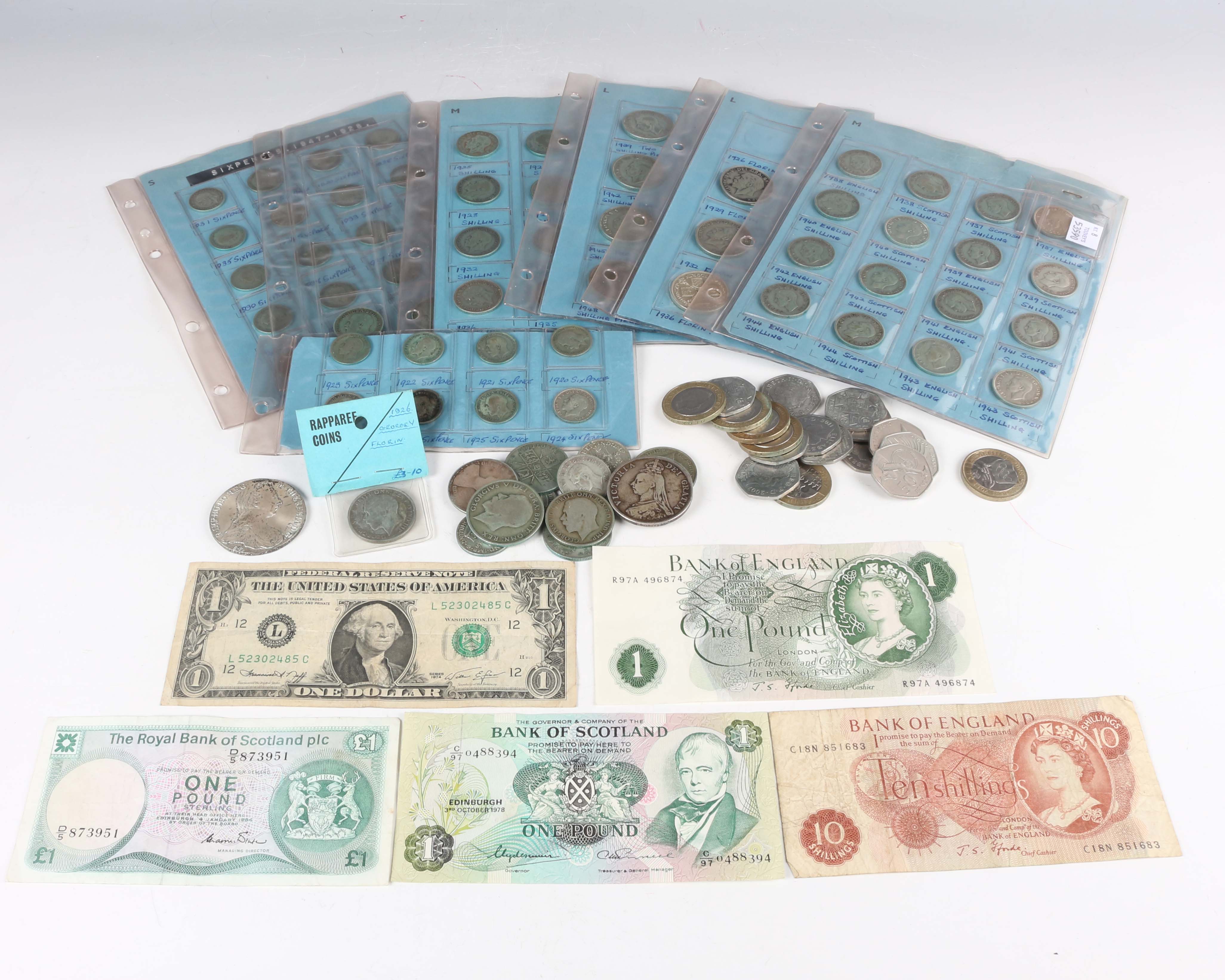 A collection of mixed British coins and banknotes, including a group of pre-1947 silver nickel coinage, including half-crowns, florins and shillings, a Victoria Jubilee Head double florin 1890, a small group of modern two pounds and fifty pences, and a Maria Theresa thaler restrike, dated 1780.