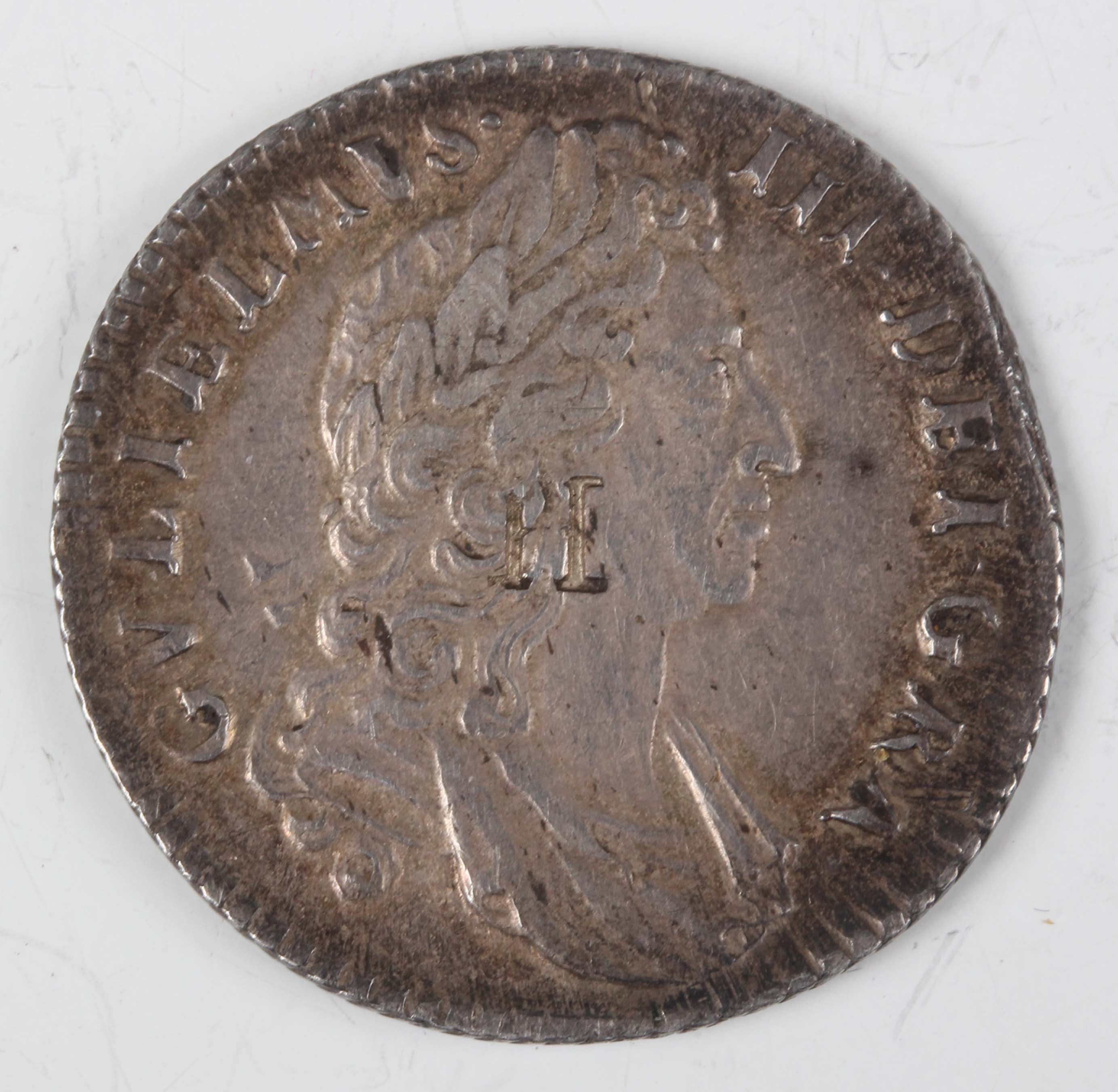 A William III milled silver shilling 1694-1702, dated 1697, first bust, counterstamp 'IL' over bust, Sp 3497 (good-very fine, lustrous fields).