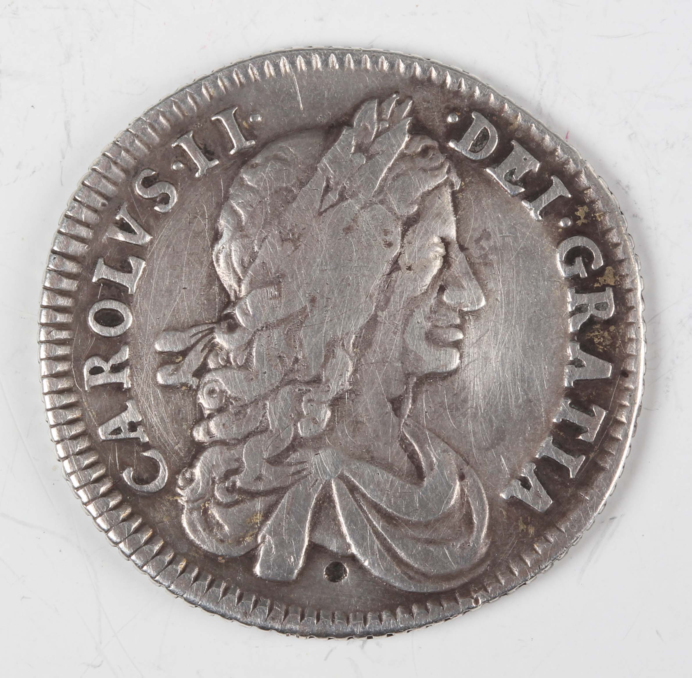 A Charles II milled silver shilling 1662-1685, dated 1663, Sp 3371 (cleaned at some point, borehole mark below bust).