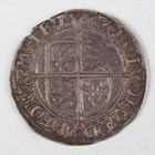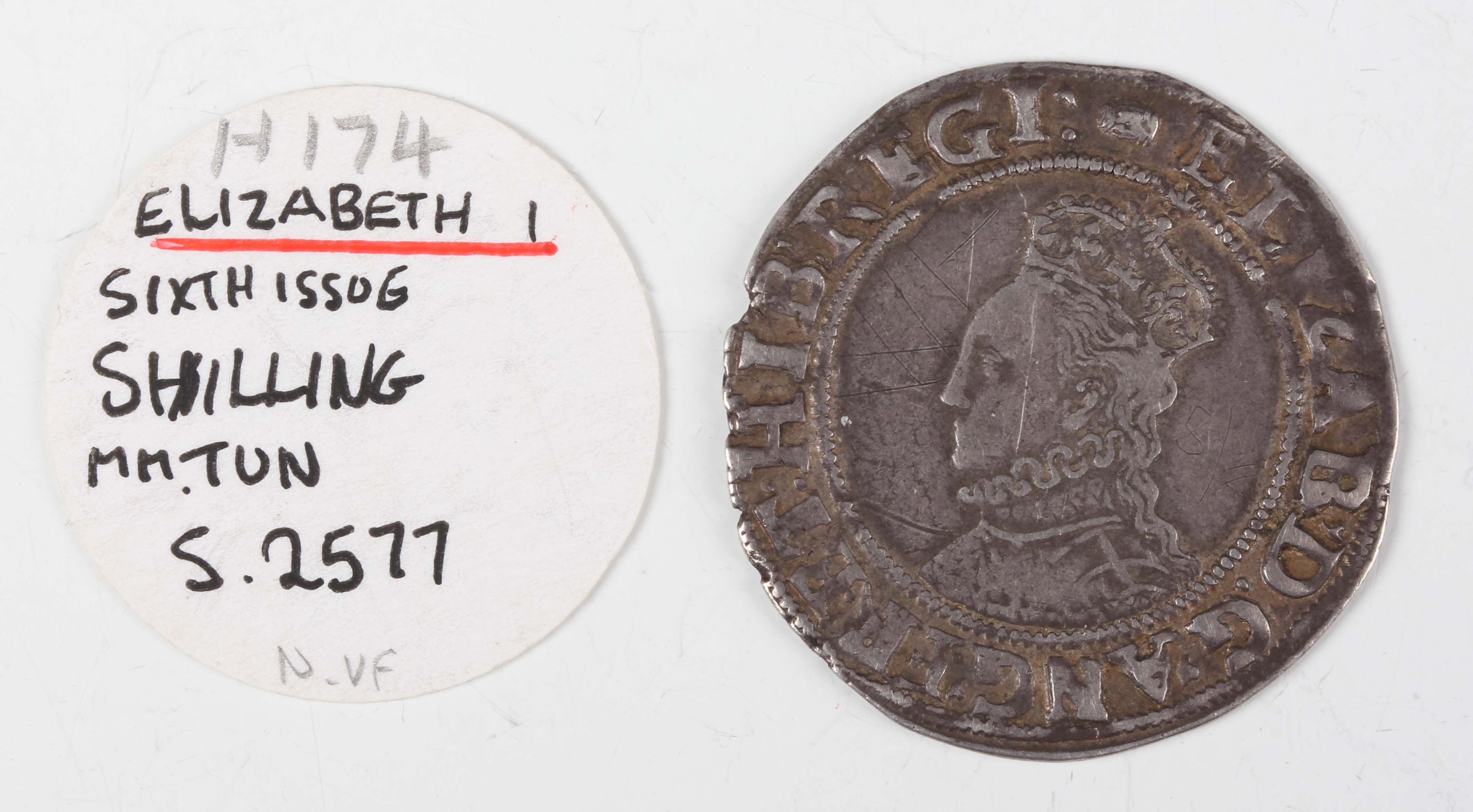 An Elizabeth I hammered silver shilling 1558-1603, sixth issue, mintmark tun, Sp 2577 (good-very fine with old cabinet tone), with an ink-written collector's ticket.