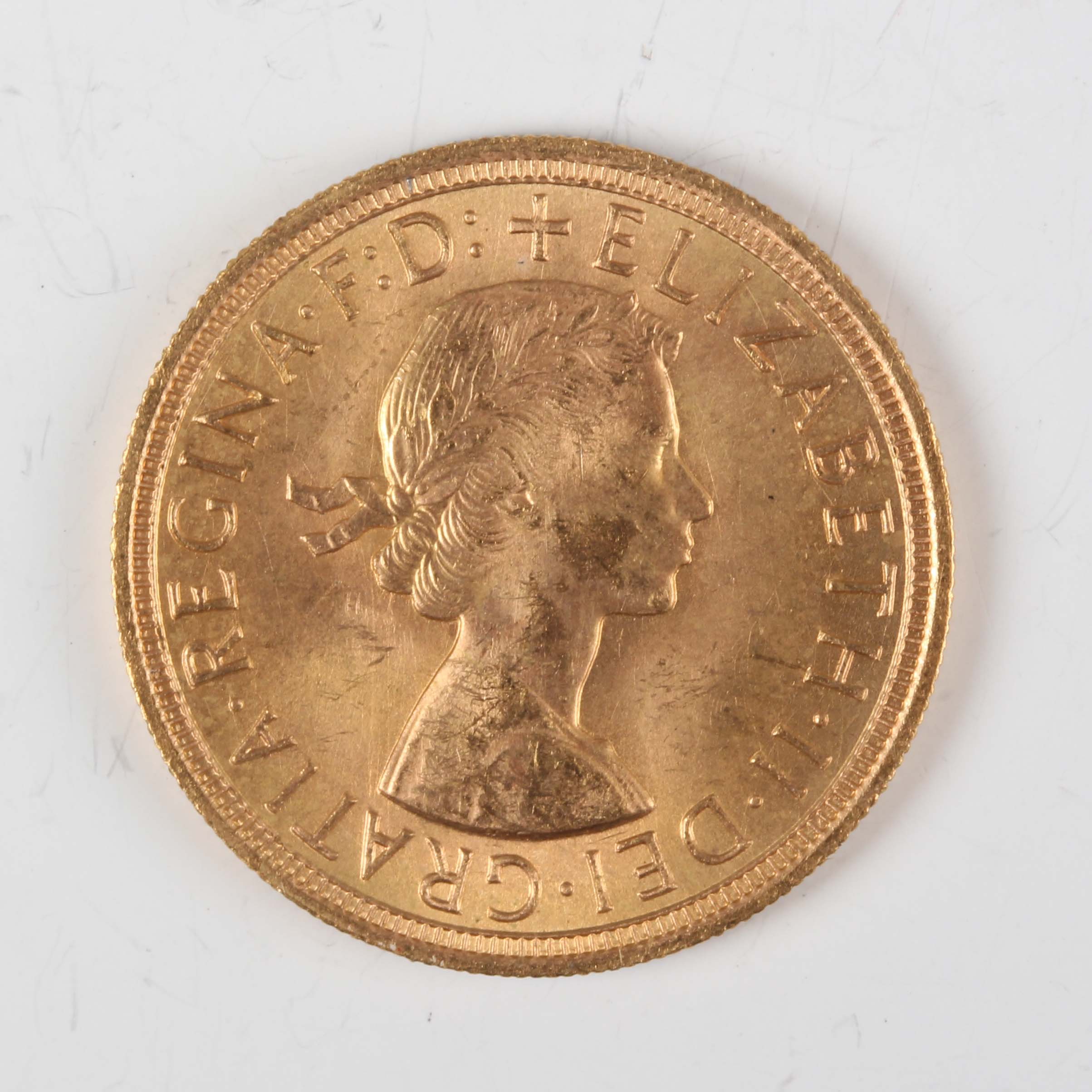 An Elizabeth II sovereign 1957. Note: this lot includes an HMRC?classified investment gold coin and is sold under standard VAT (not margin scheme). The hammer price is VAT?exempt. VAT is charged only on the Buyer’s Premium, shown separately, and may be recoverable depending on the buyer’s VAT status.