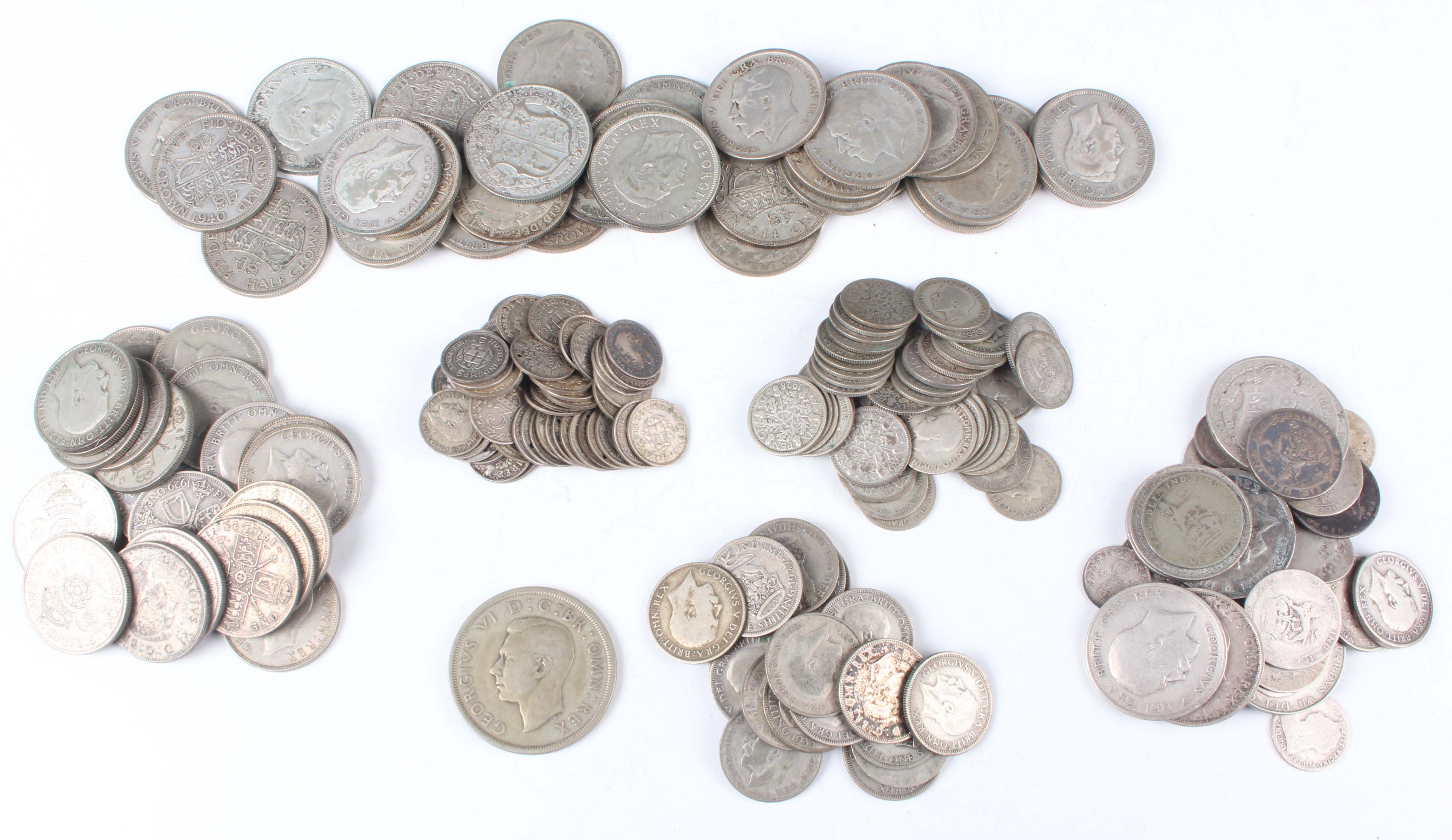 A large collection of pre-1947 British silver nickel coinage, comprising a single crown, half-crowns, florins, shillings, sixpences and threepences, together with a small collection of Victorian and later silver coinage, including half-crowns, florins, shillings, sixpences and threepences.